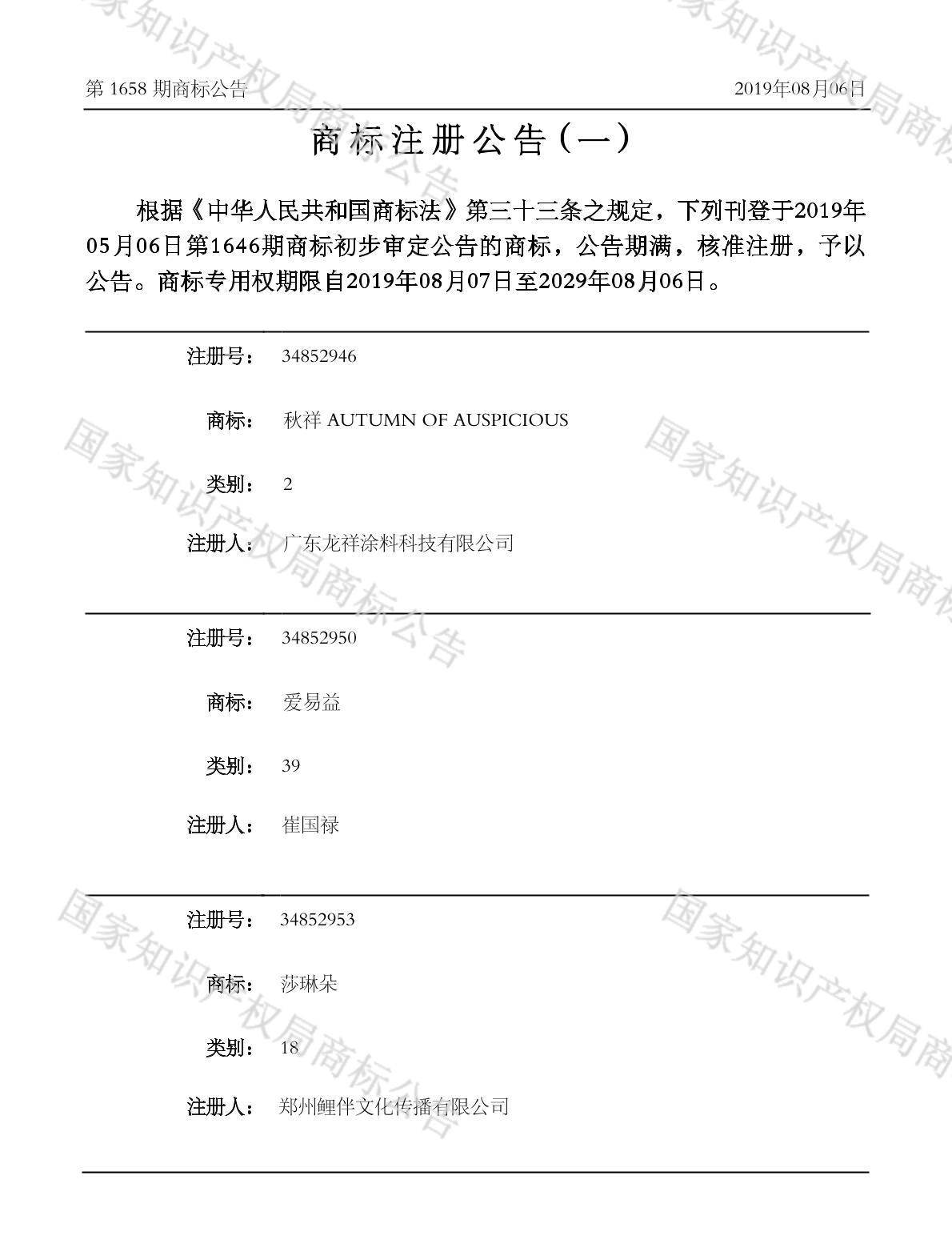 有效期限:2029-08-06 组合类型:中文注册号:34852953