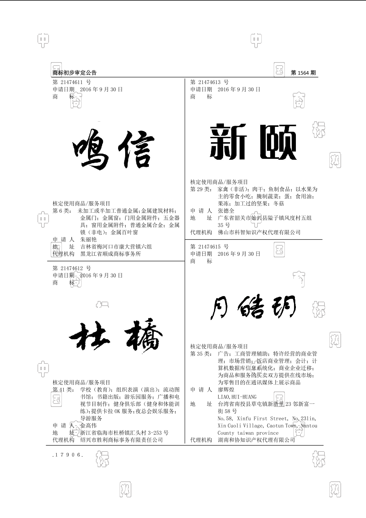 初审公告期号:1564