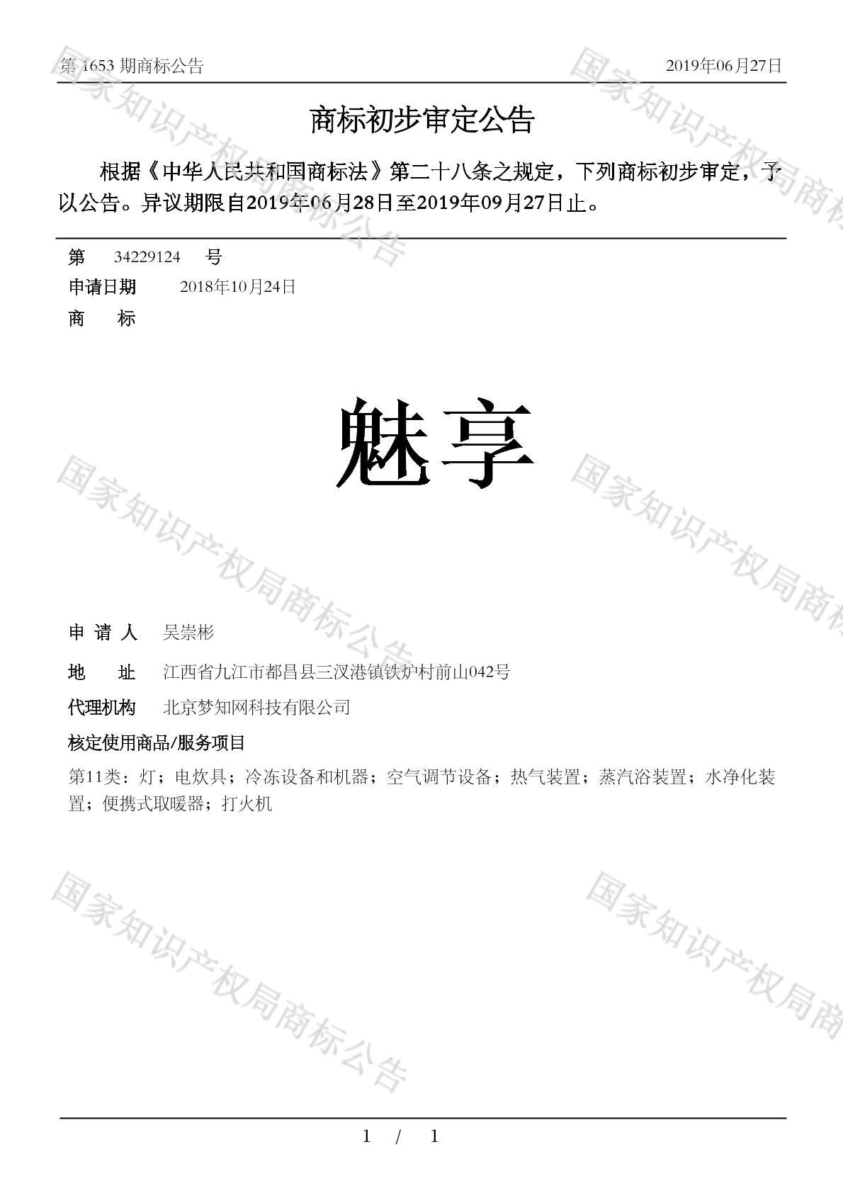 有效期限:2029-09-27 组合类型:中文注册号:34229124