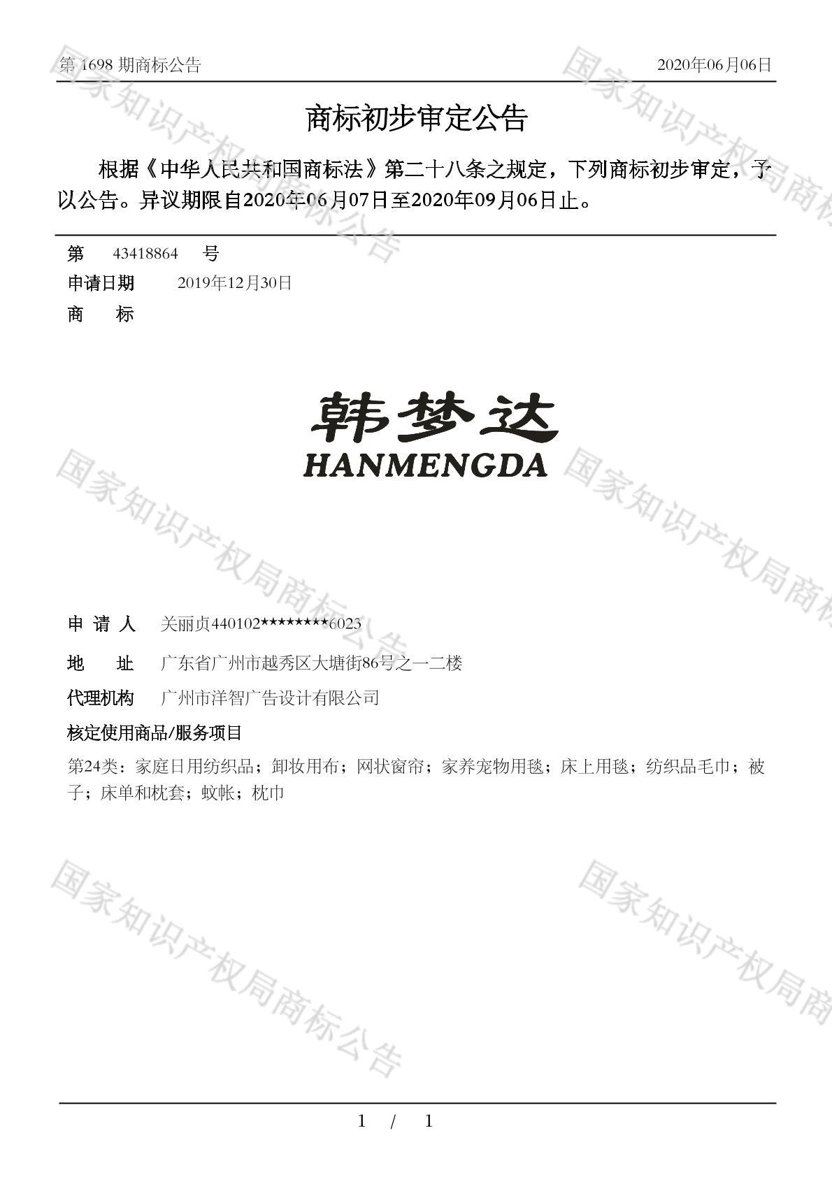 有效期限:2030-09-06 组合类型:中文注册号:43418864