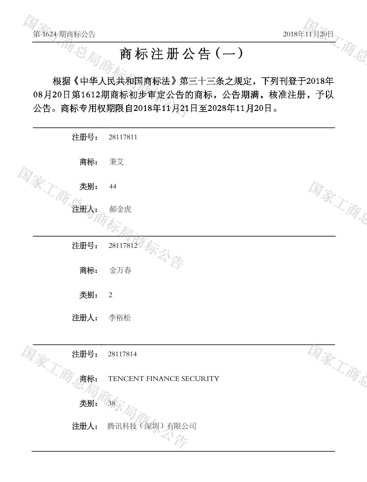 有效期限:2028-11-20 组合类型:中文注册号:28117811