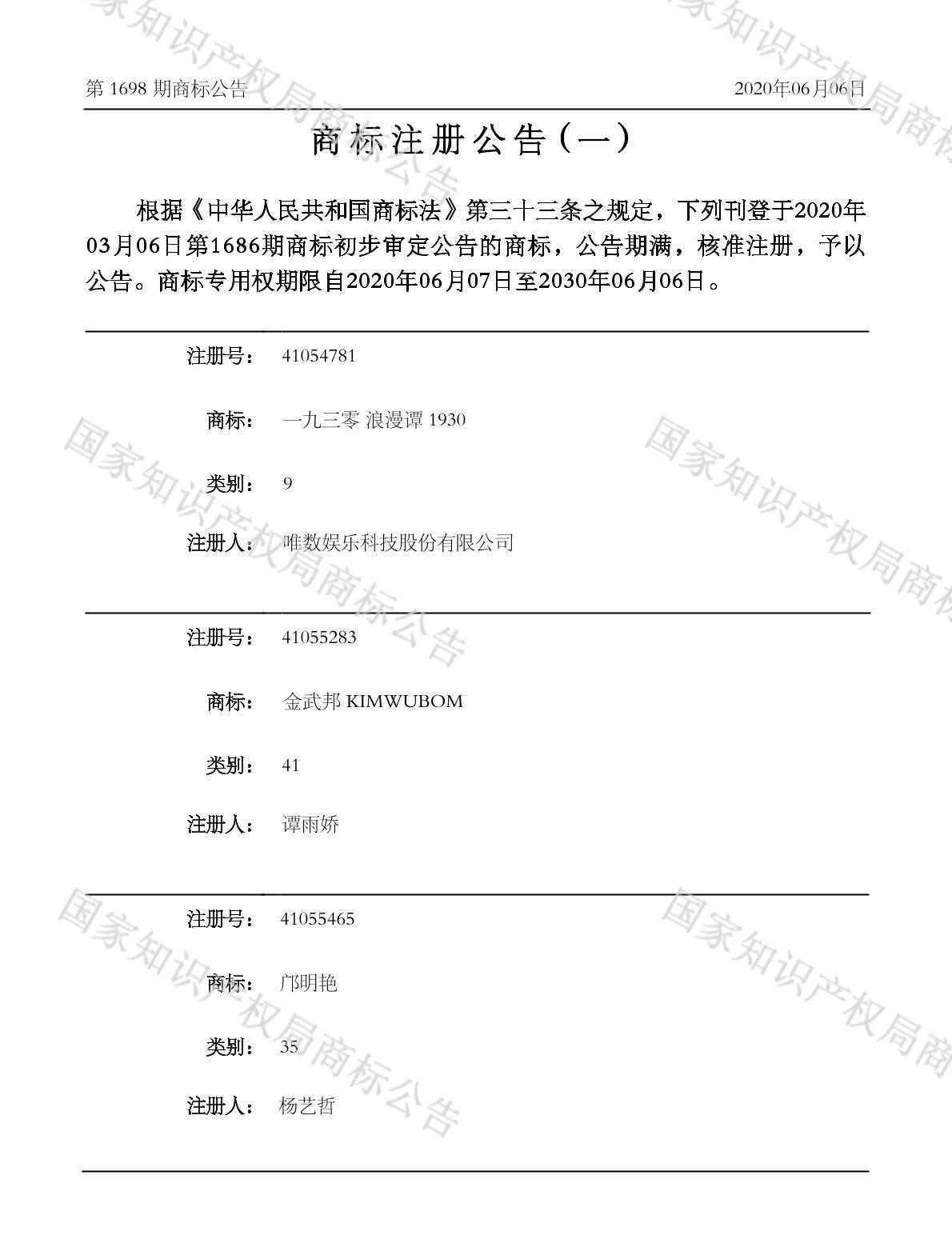 注册公告期号:1698