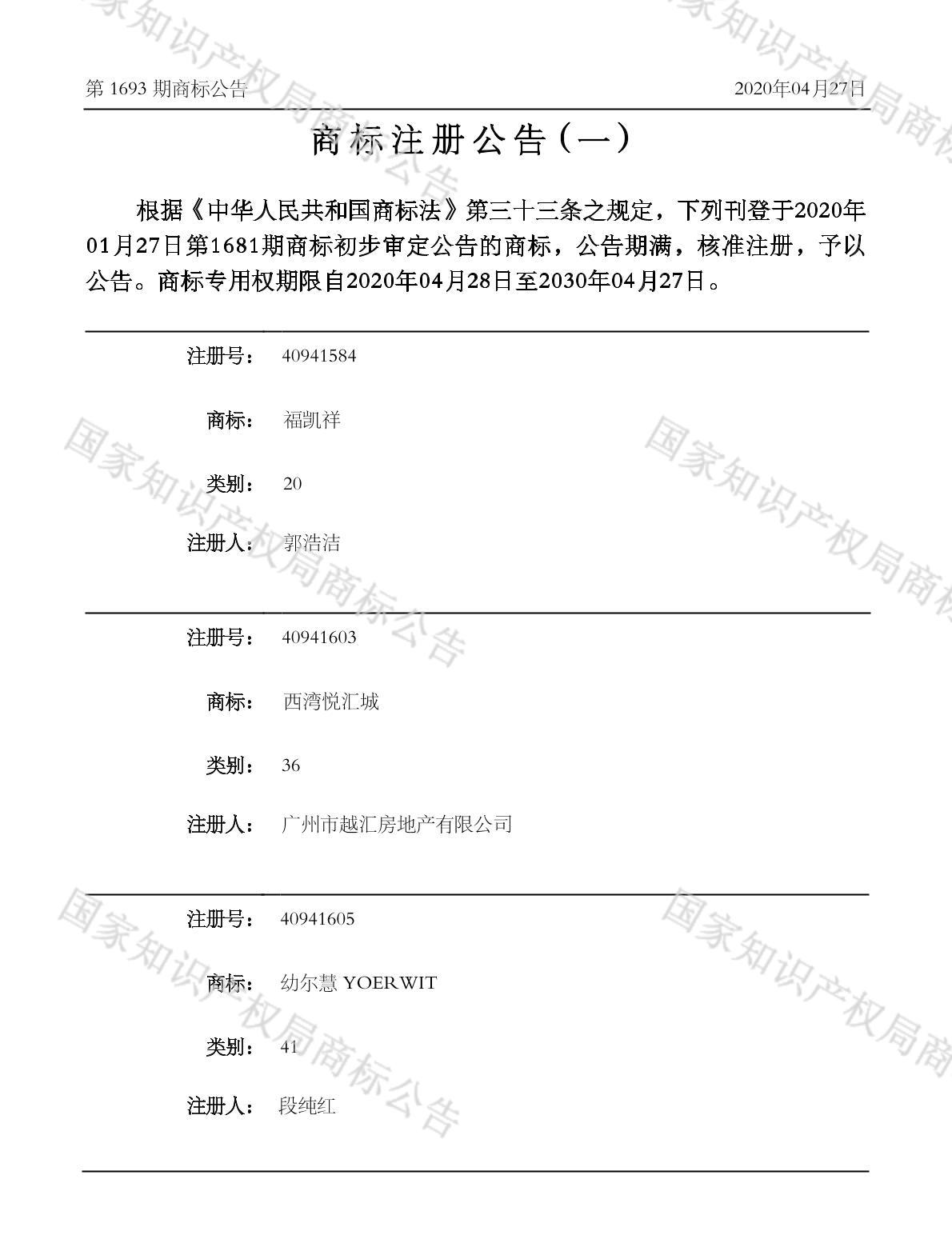 有效期限:2030-04-27 组合类型:中文注册号:40941605