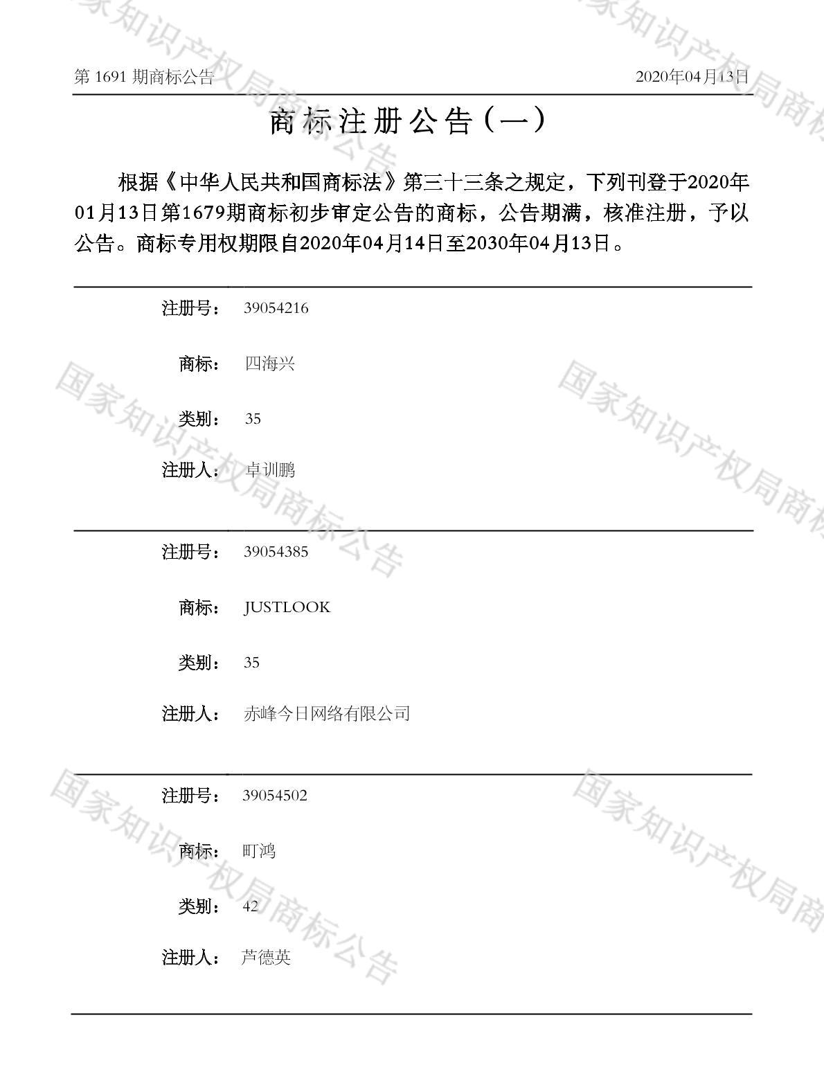 有效期限:2030-04-13 组合类型:中文注册号:39054502