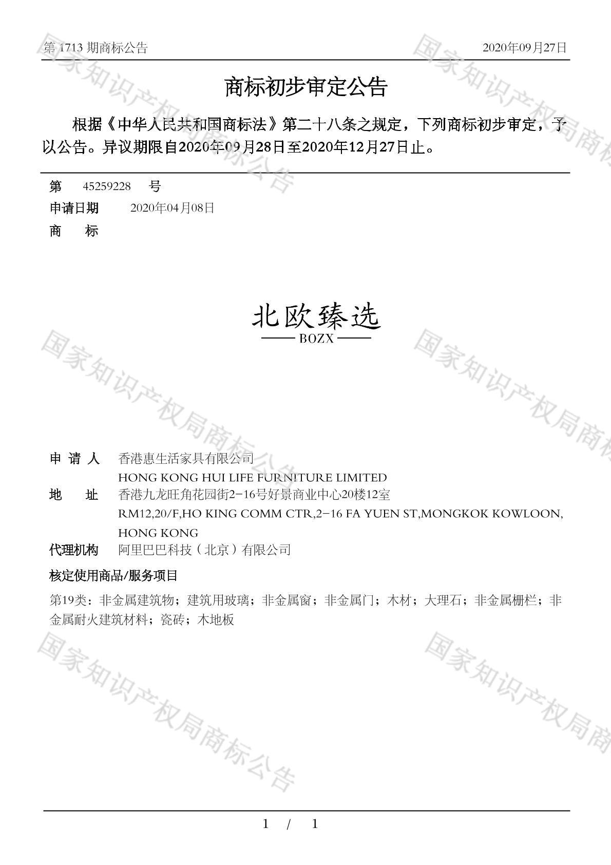 您当前位置:首页商标转让19类商标北欧臻选 BOZX