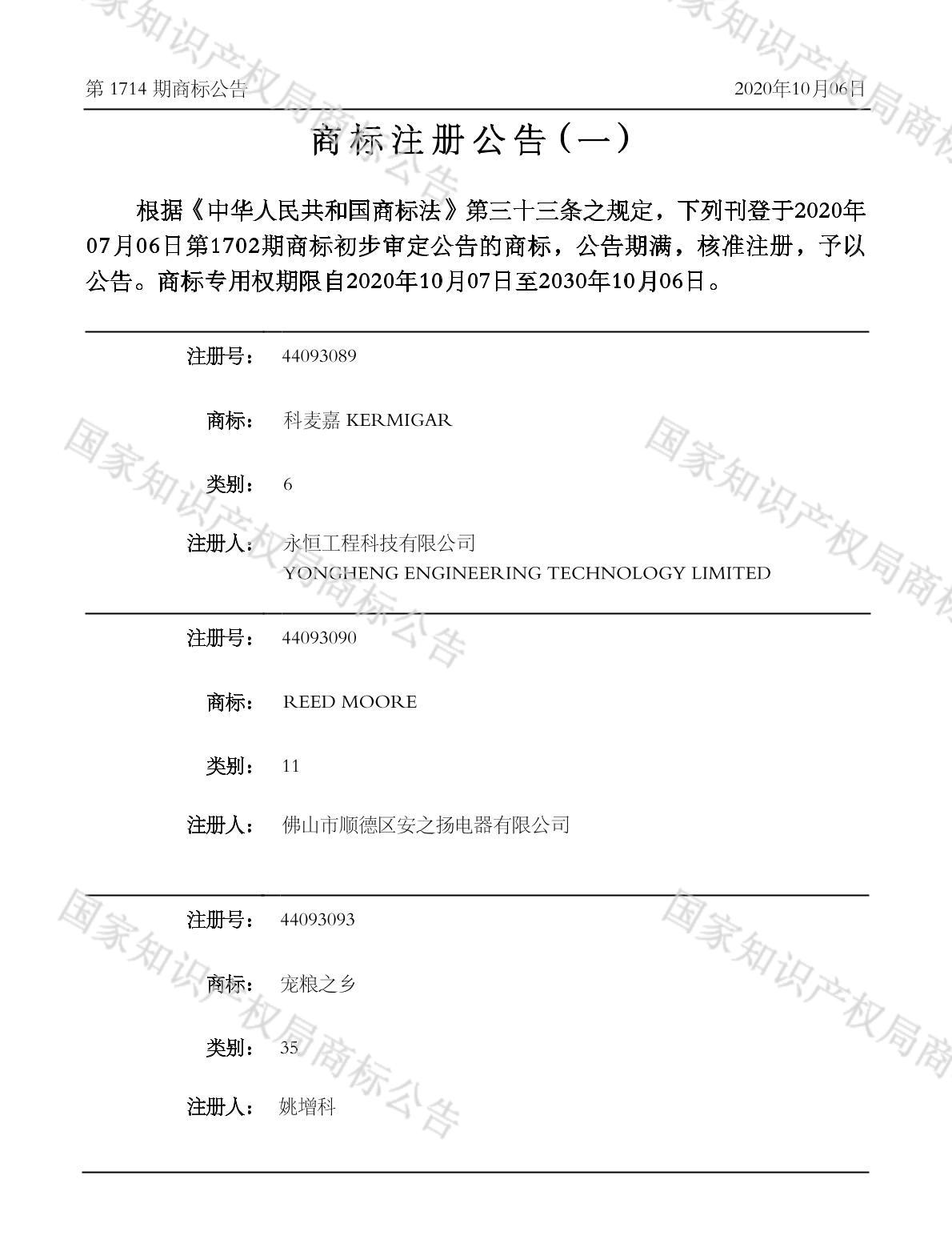 有效期限:2030-10-06 组合类型:中文注册号:44093089