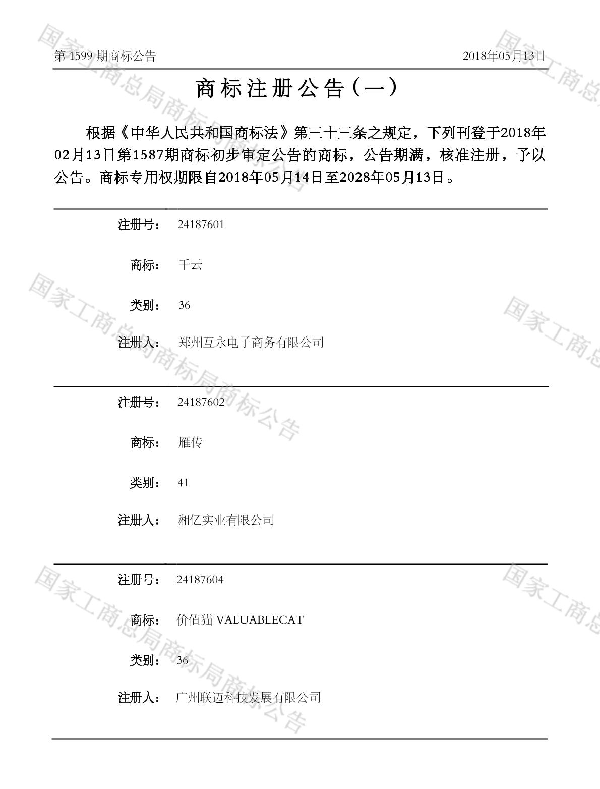 注册公告期号:1599