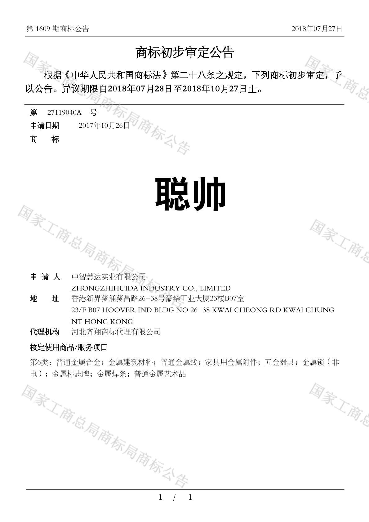 有效期限:2028-10-27 组合类型:中文注册号:27119040A