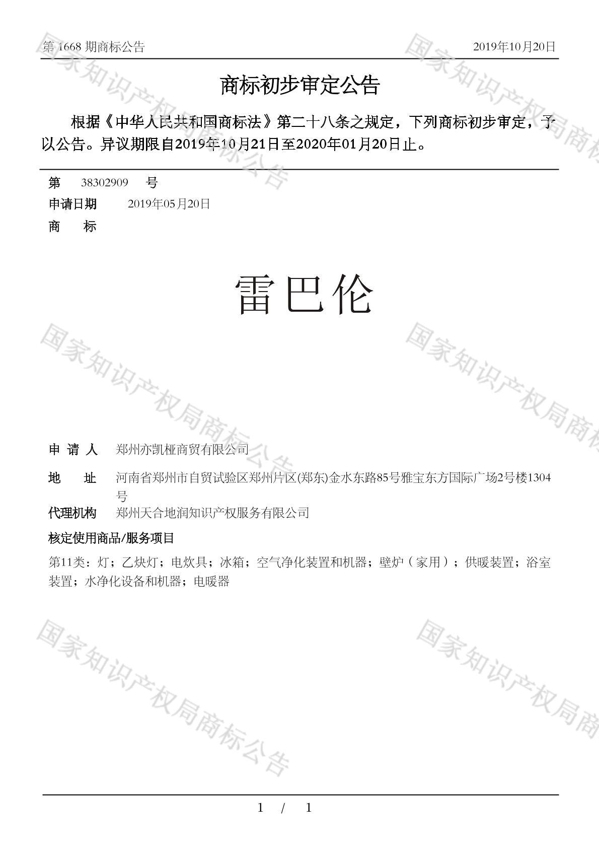 有效期限:2030-01-20 组合类型:中文注册号:38302909