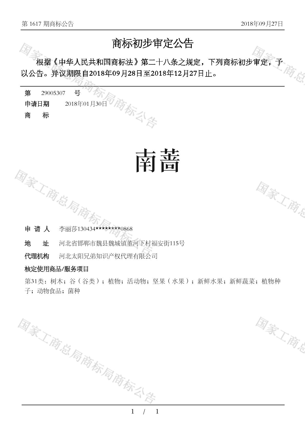 注册公告期号:1629