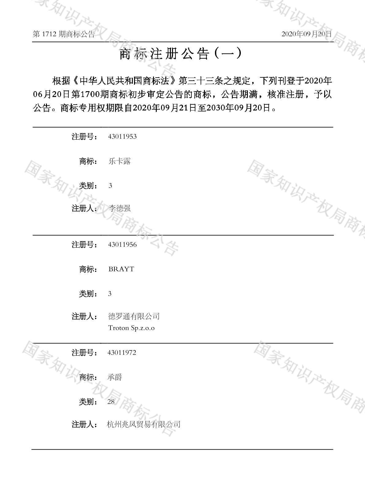 有效期限:2030-09-20 组合类型:中文注册号:43011972