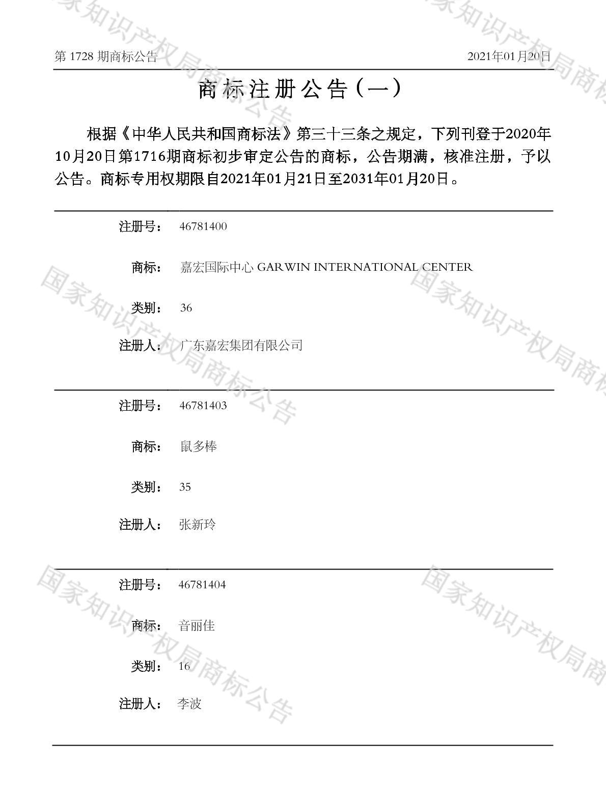 有效期限:2031-01-20 组合类型:中文注册号:46781403