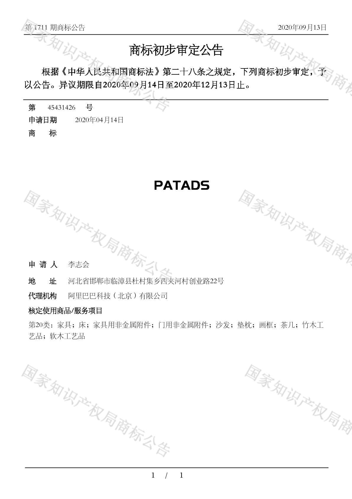 您当前位置:首页商标转让20类商标PATADS