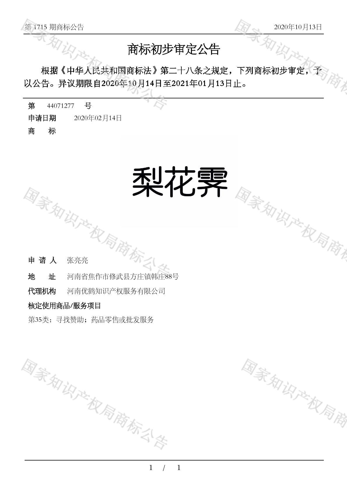 有效期限:2031-01-13 组合类型:中文注册号:44071277