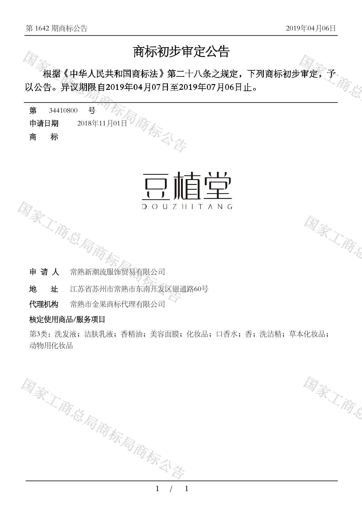 有效期限:2029-07-06 组合类型:中文注册号:34410800