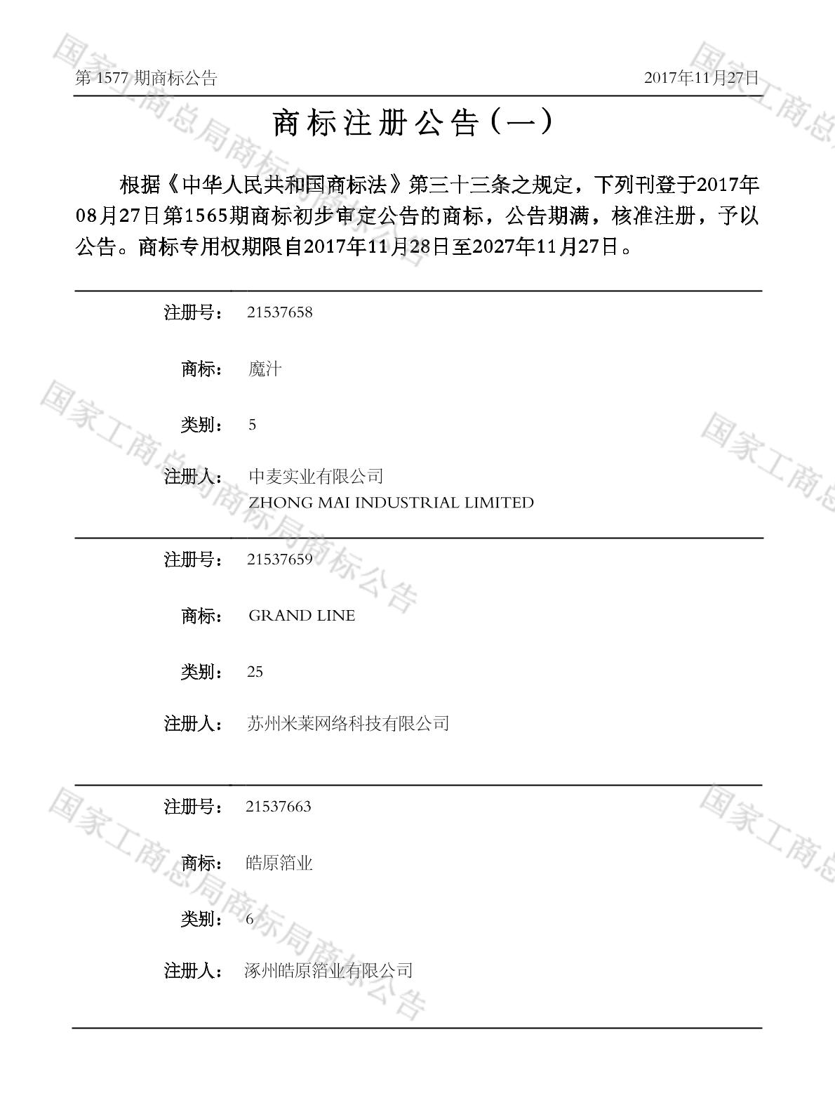 有效期限:2027-11-27 组合类型:中文注册号:21537658
