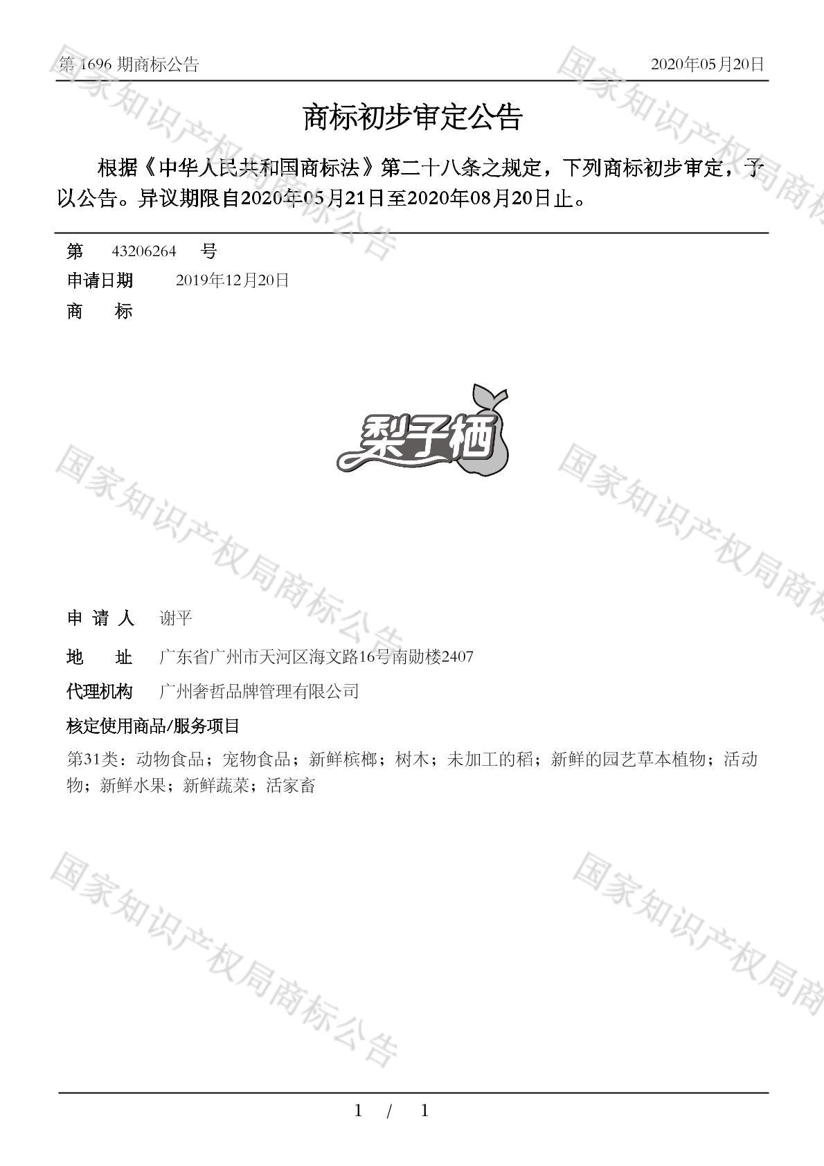 有效期限:2030-08-20 组合类型:中文注册号:43206264