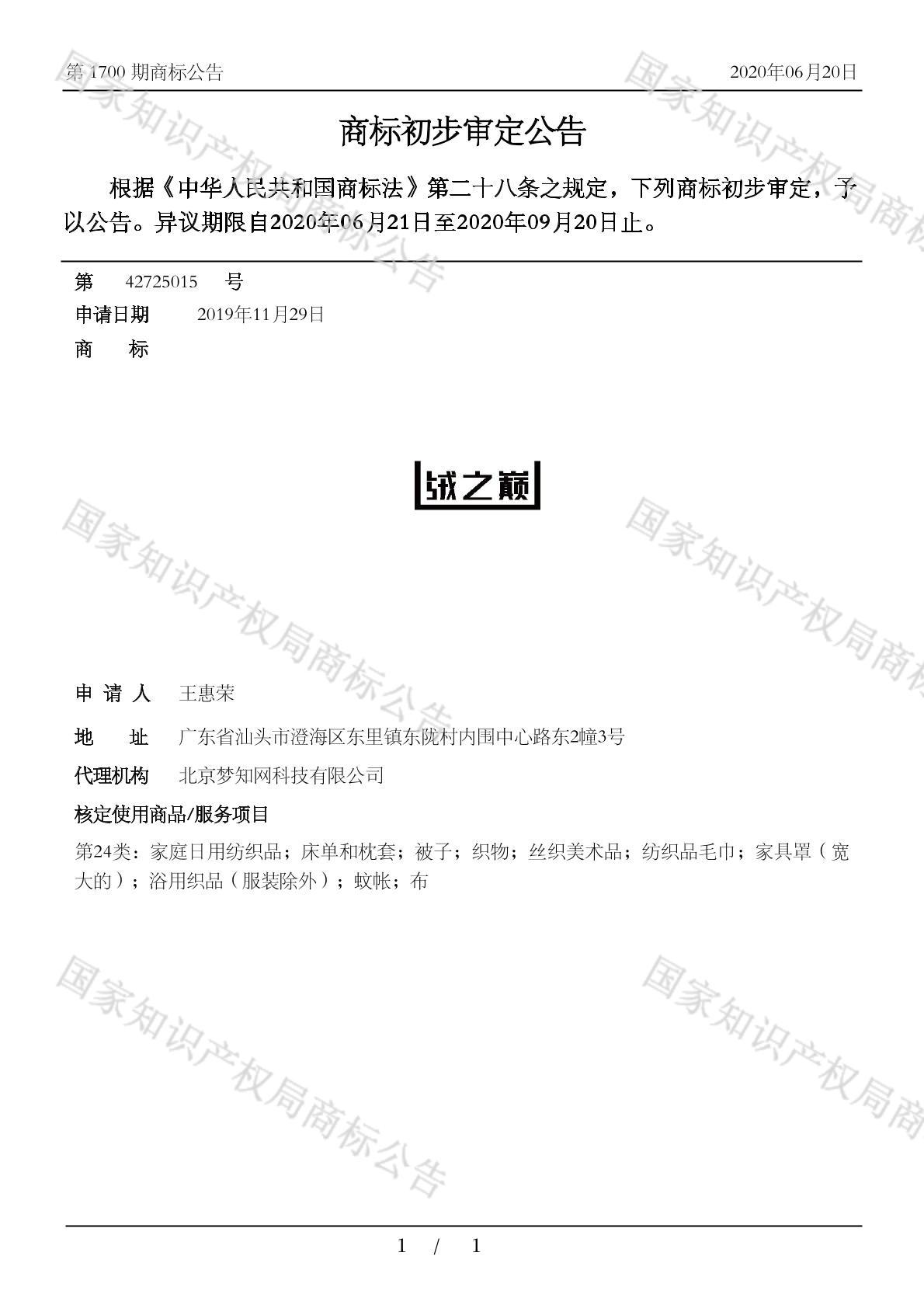 有效期限:2030-09-20 组合类型:中文注册号:42725015