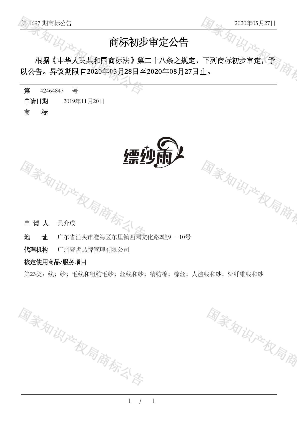 有效期限:2030-08-27 组合类型:中文注册号:42464847