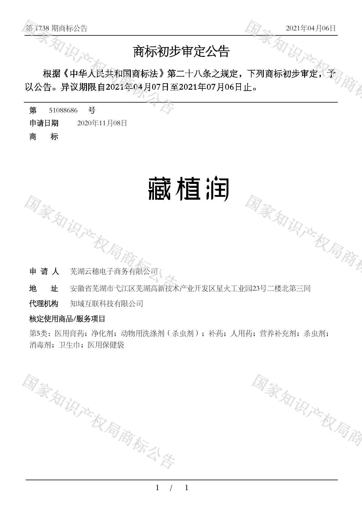 有效期限:2031-07-06 组合类型:中文注册号:51088686