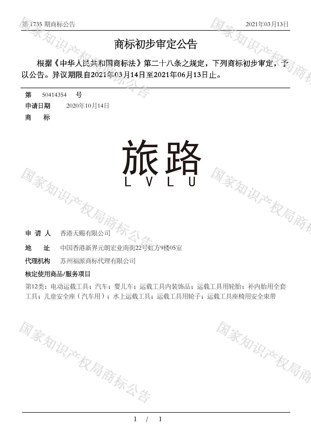 有效期限:2031-06-13 组合类型:中文注册号:50414354