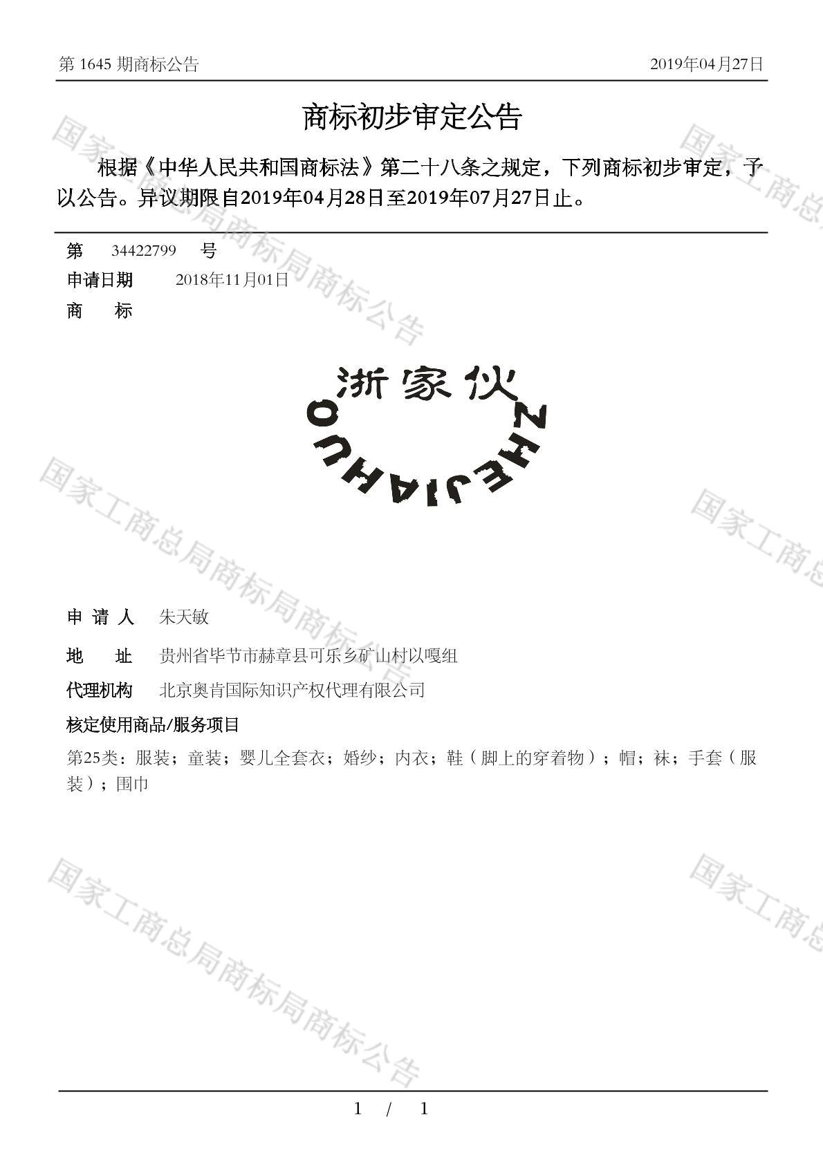 有效期限:2029-07-27 组合类型:中文注册号:34422799