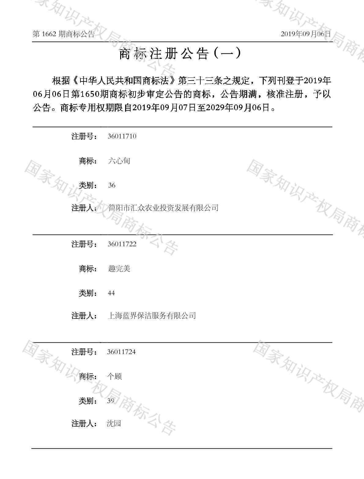 有效期限:2029-09-06 组合类型:中文注册号:36011722
