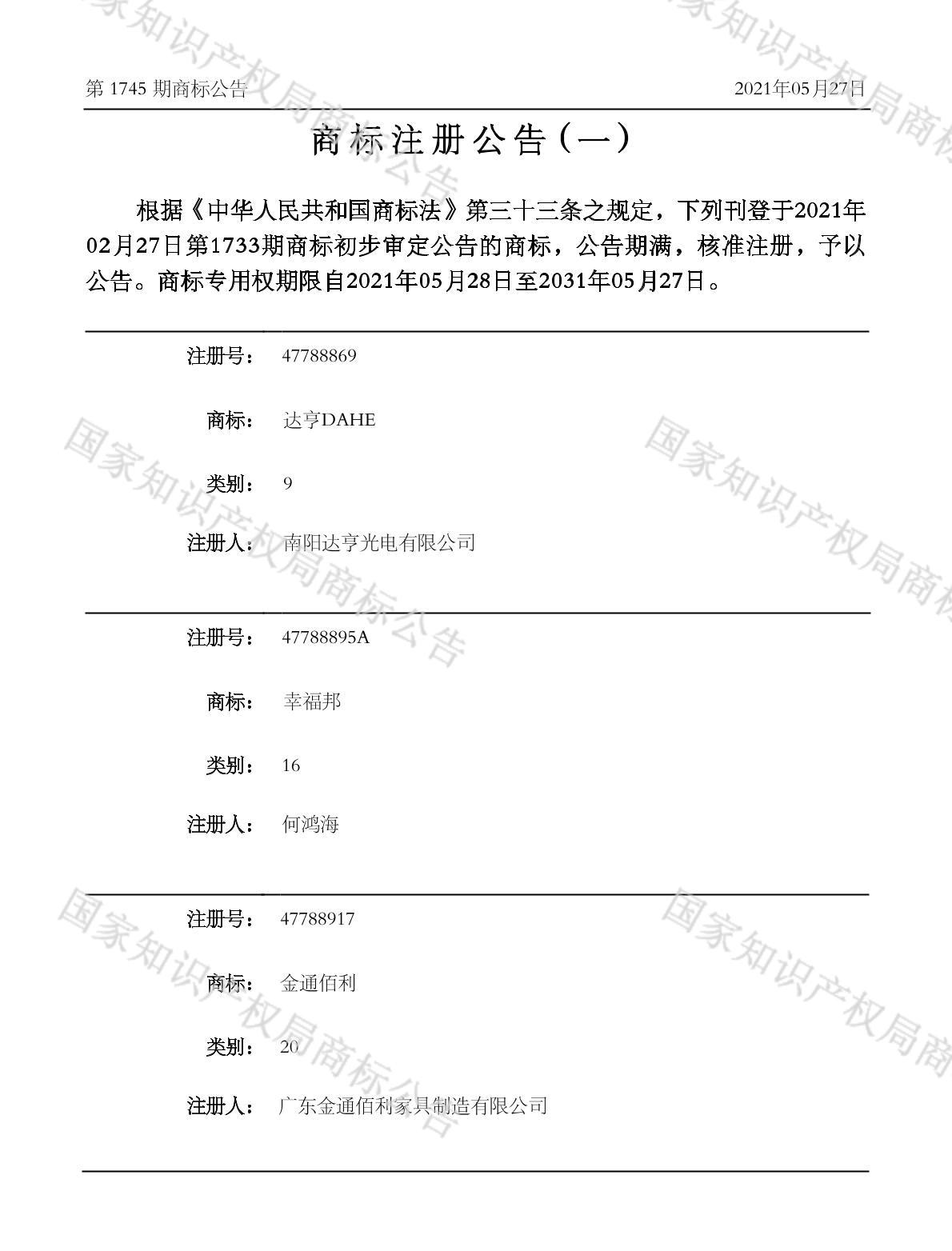 有效期限:2031-05-27 组合类型:中文注册号:47788895A