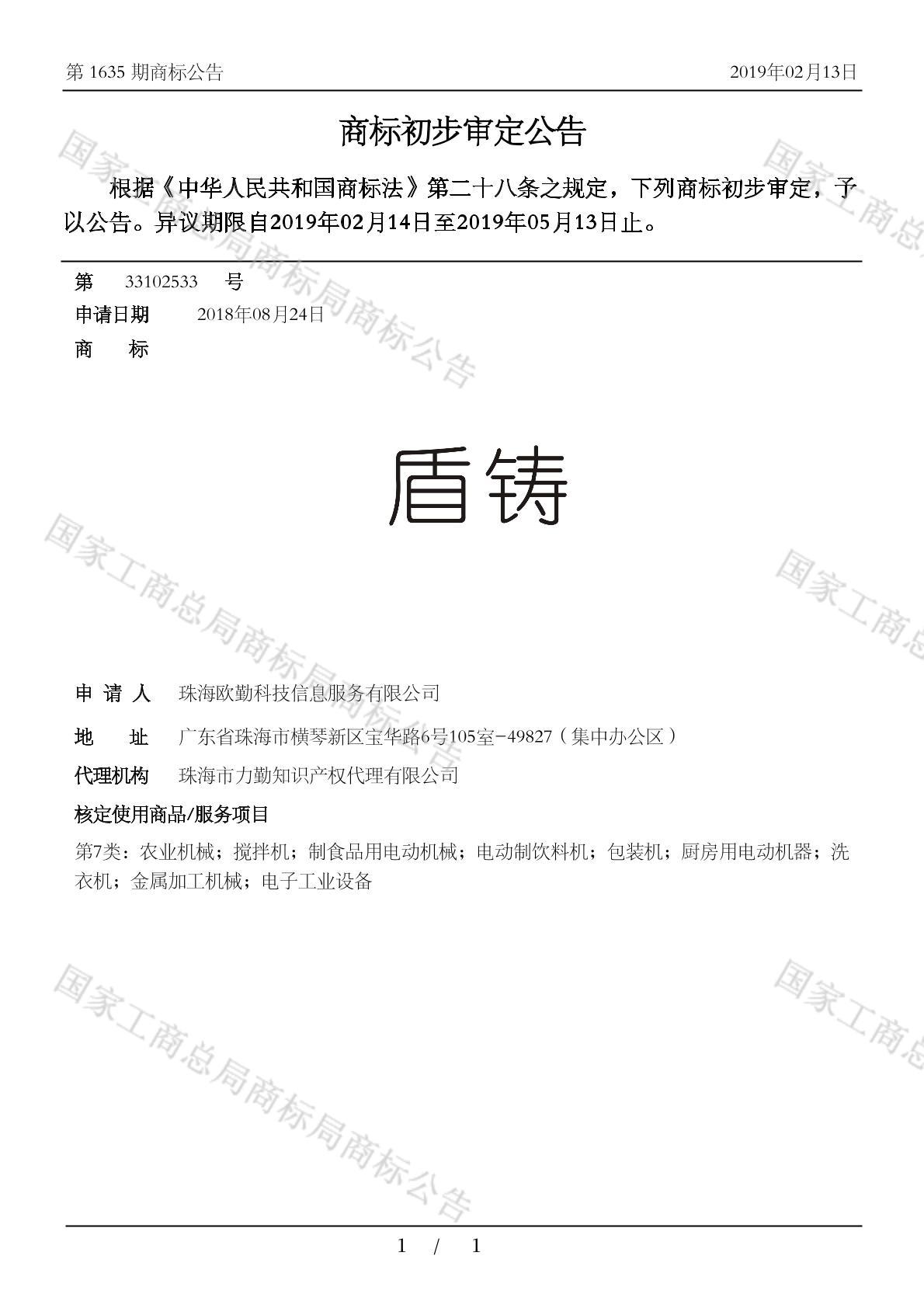 有效期限:2029-05-13 组合类型:中文注册号:33102533