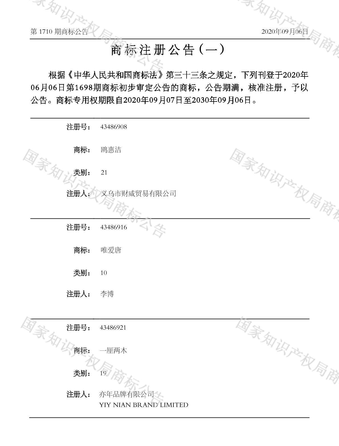 有效期限:2030-09-06 组合类型:中文注册号:43486916