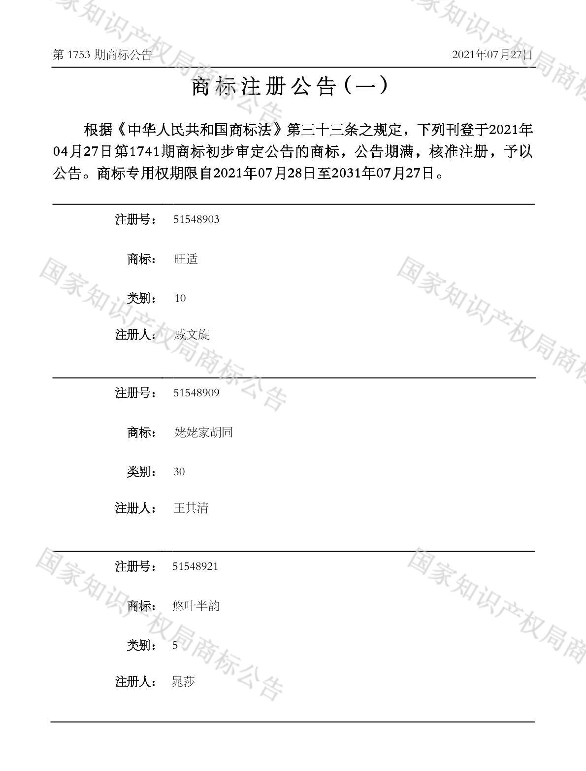 有效期限:2031-07-27 组合类型:中文注册号:51548921