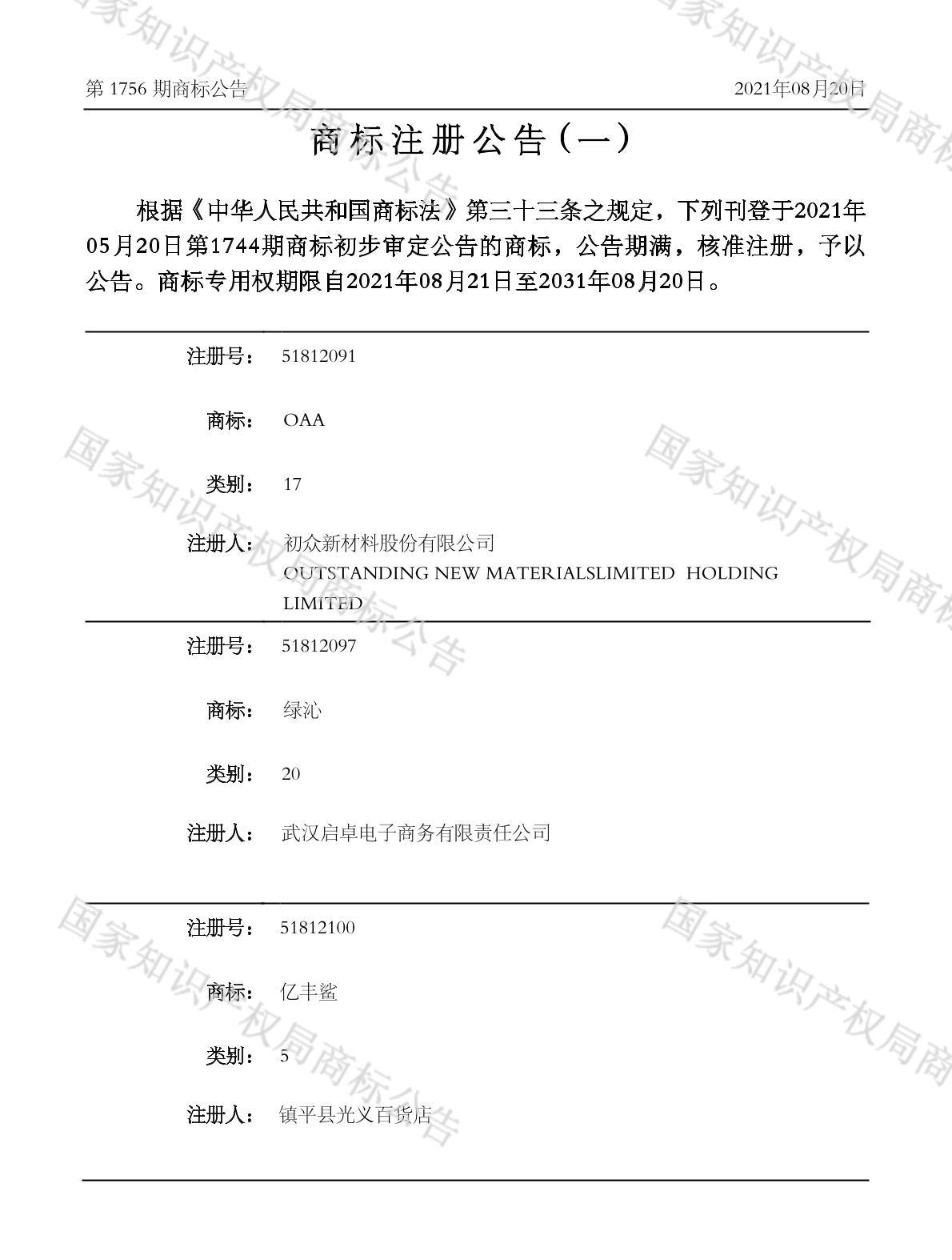 有效期限:2031-08-20 组合类型:中文注册号:51812100