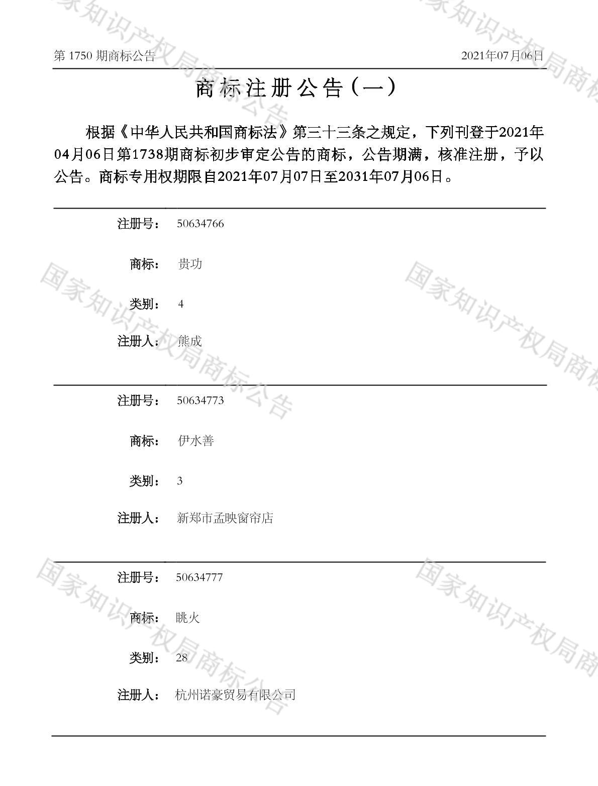 有效期限:2031-07-06 组合类型:中文注册号:50634773