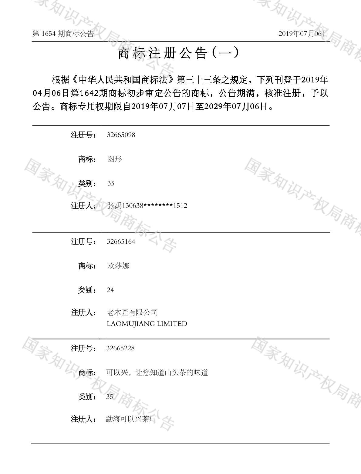 有效期限:2029-07-06 组合类型:中文注册号:32665164
