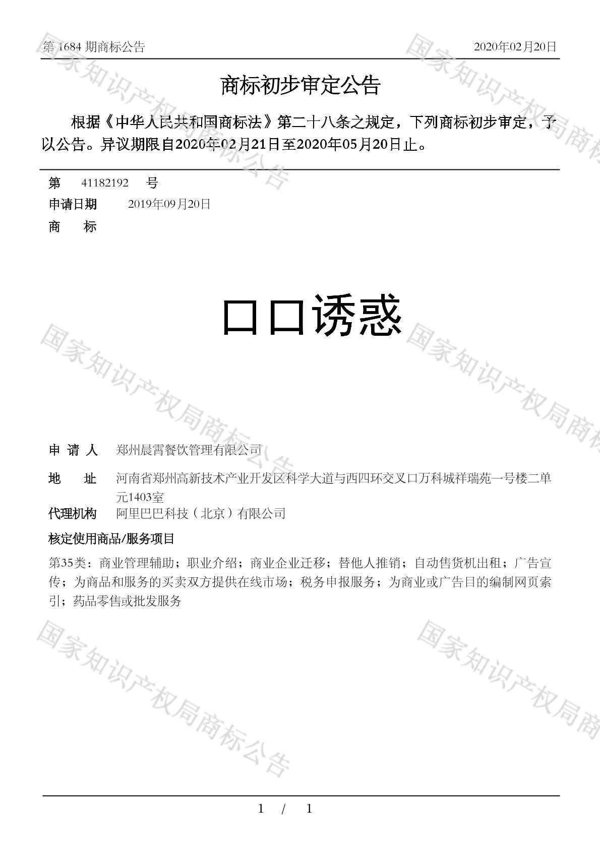 有效期限:2030-05-20 组合类型:中文注册号:41182192