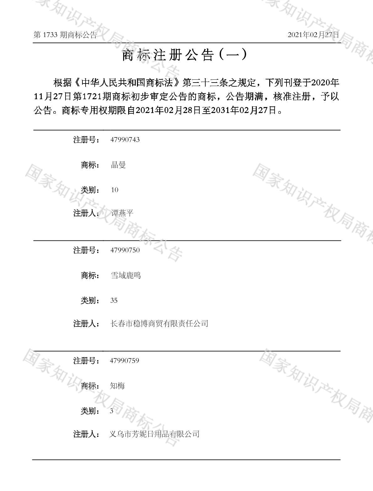 有效期限:2031-02-27 组合类型:中文注册号:47990743