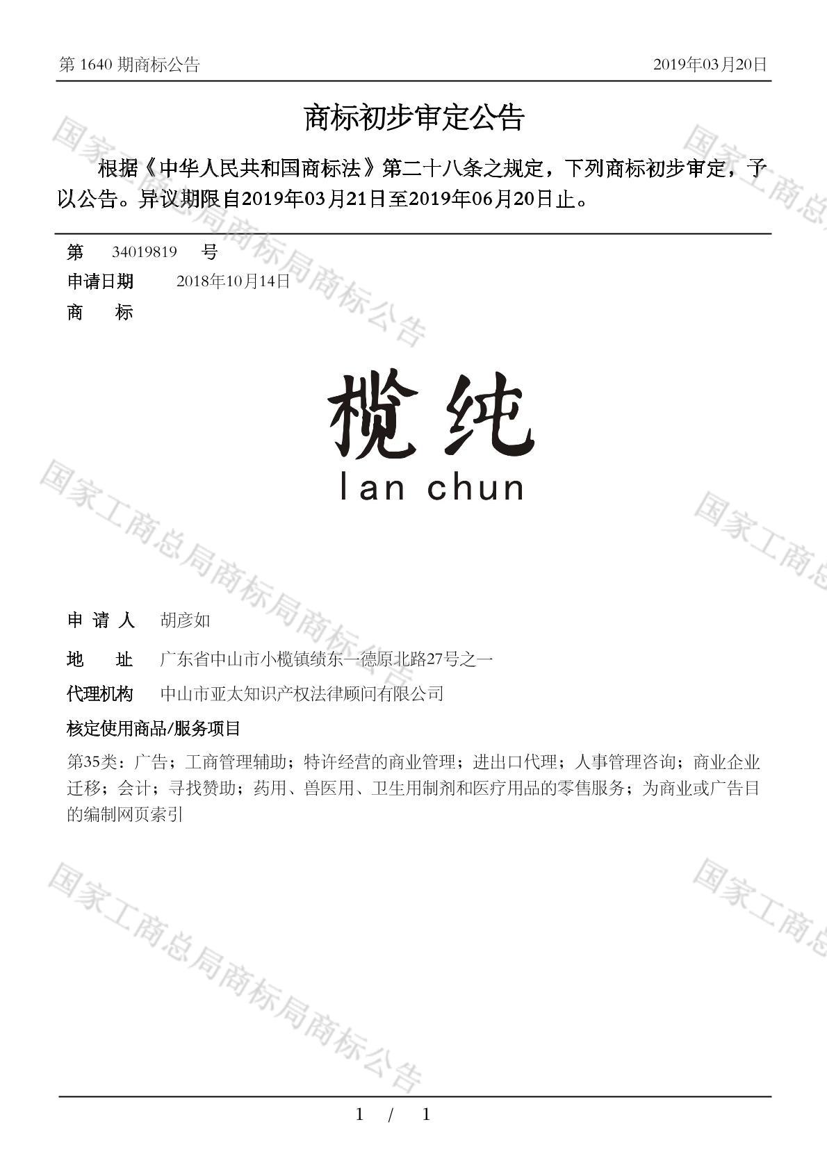 有效期限:2029-06-20 组合类型:中文注册号:34019819