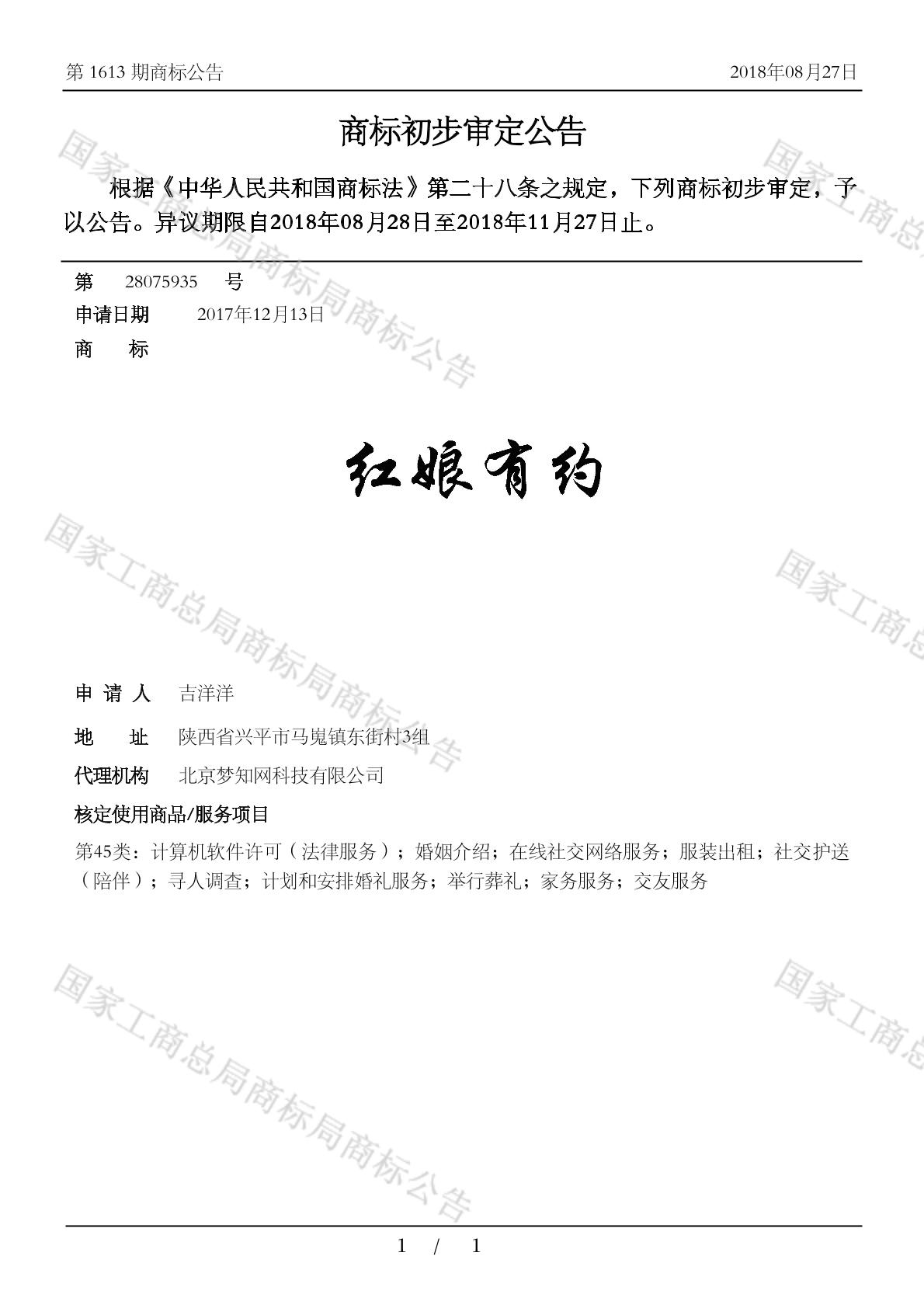 侦探服务 家务服务 社交陪伴 服装出租 交友服务 在线社交网络服务 婚姻介绍 计划和安排婚礼服务 知识产权咨询 知识产权许可