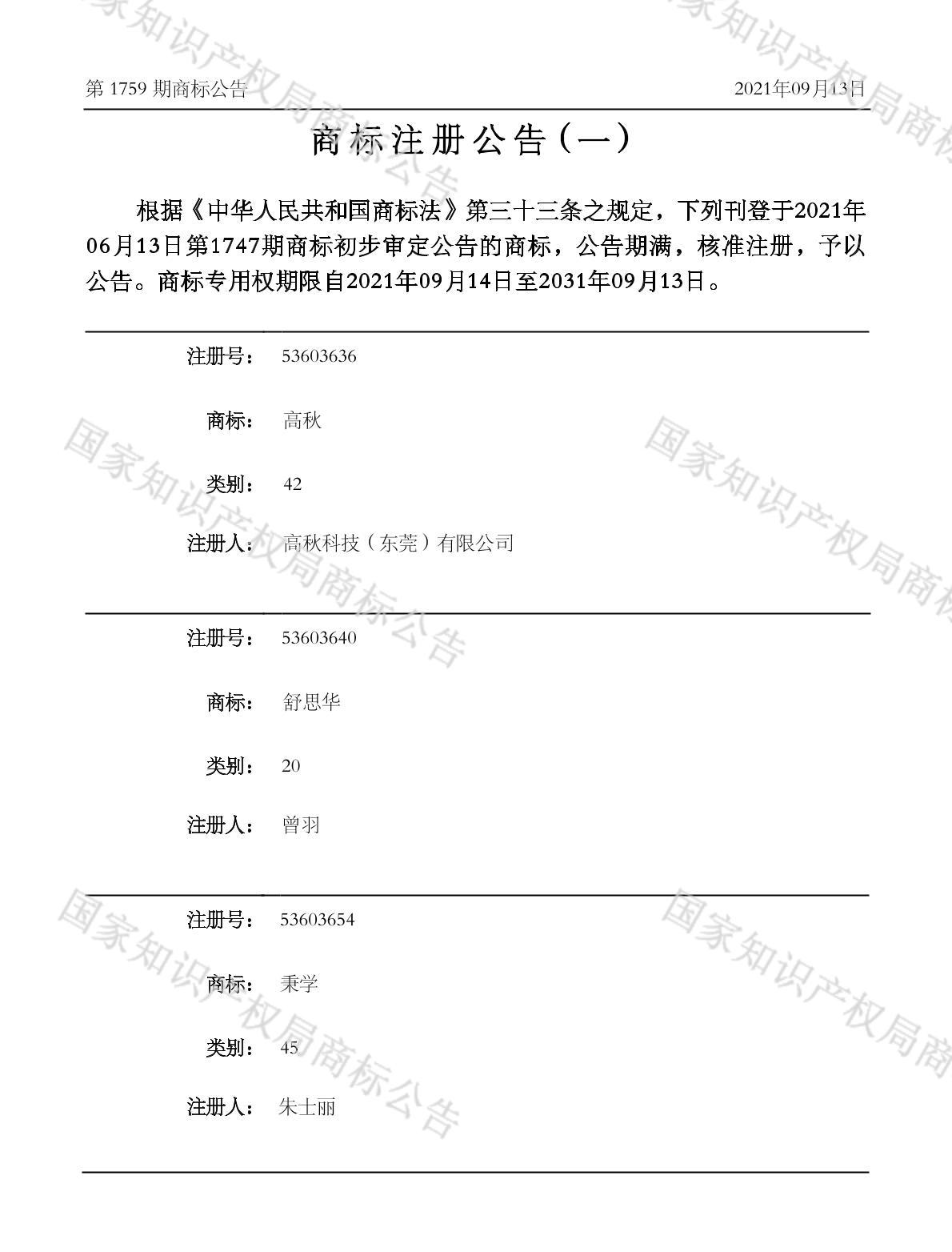 有效期限:2031-09-13 组合类型:中文注册号:53603654