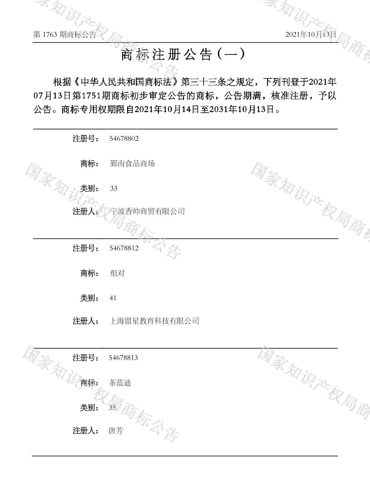 有效期限:2031-10-13 组合类型:中文注册号:54678813