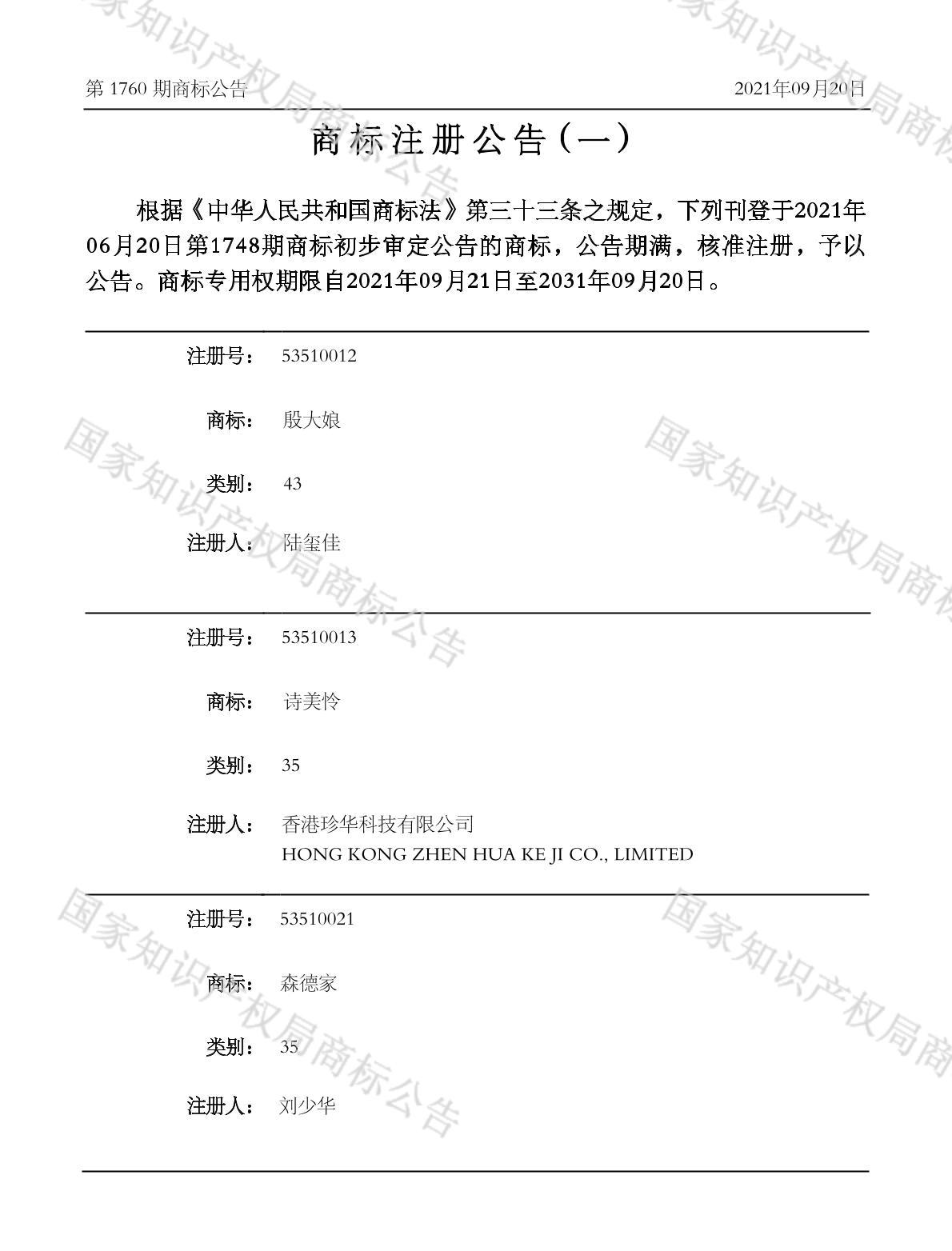 有效期限:2031-09-20 组合类型:中文注册号:53510013