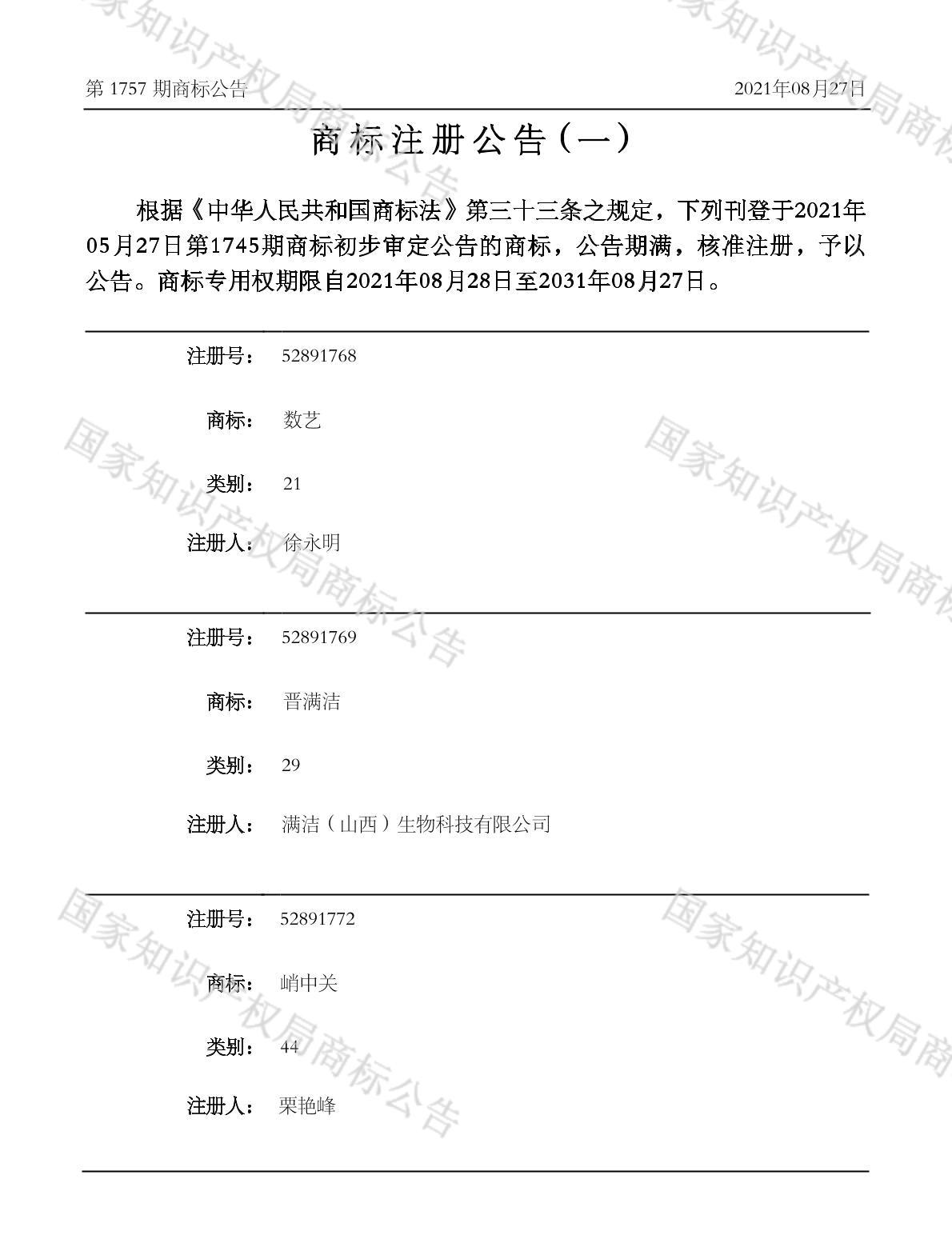 有效期限:2031-08-27 组合类型:中文注册号:52891768