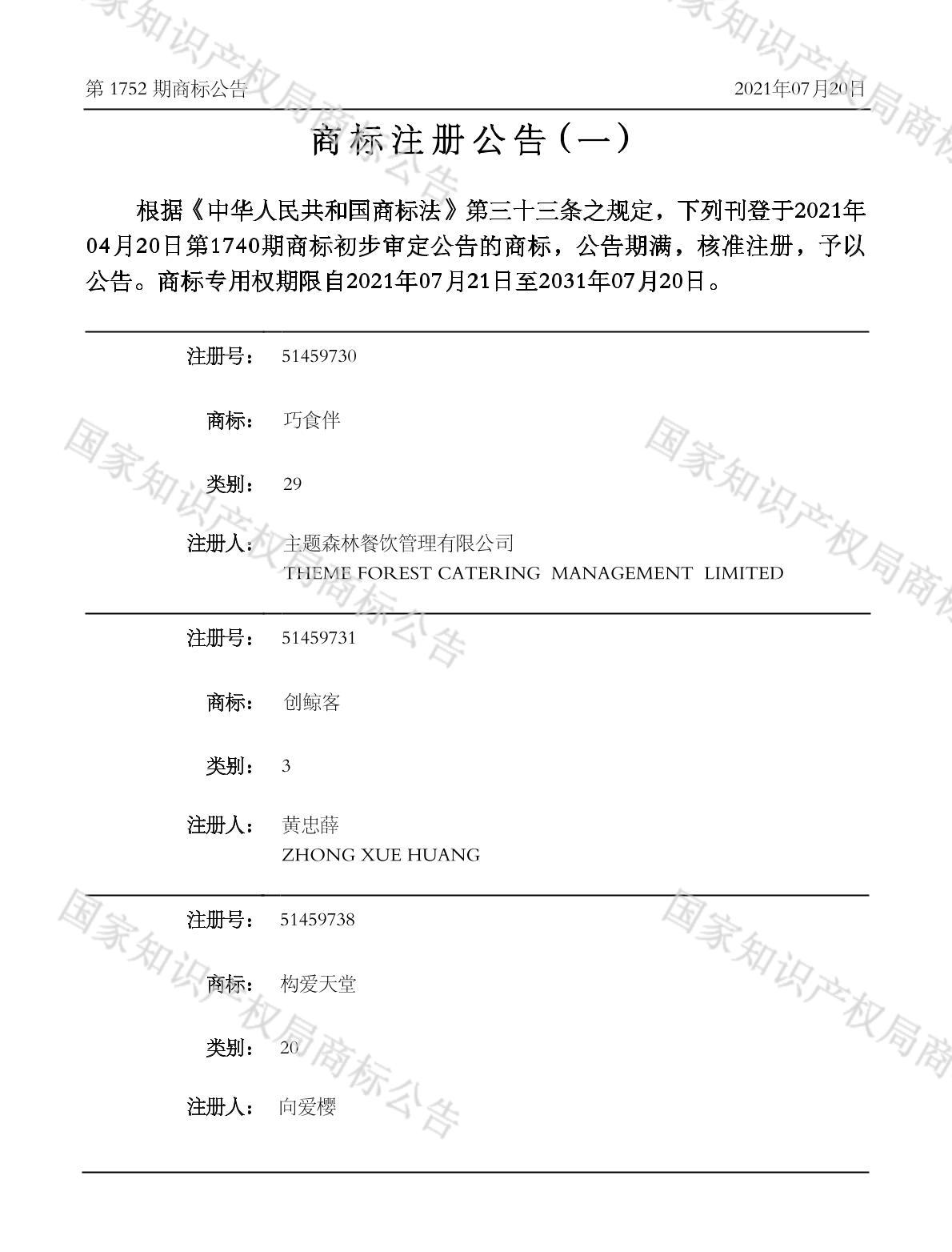 有效期限:2031-07-20 组合类型:中文注册号:51459738