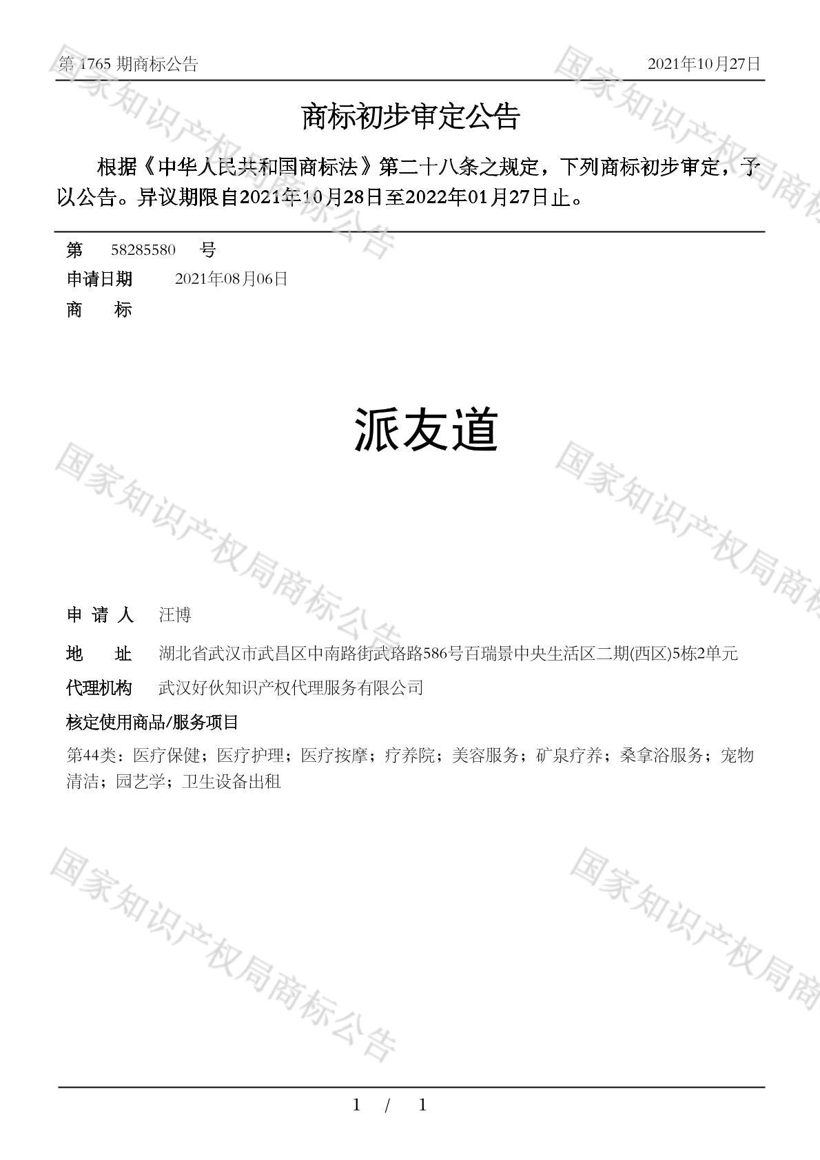 有效期限:2032-01-27 组合类型:中文注册号:58285580