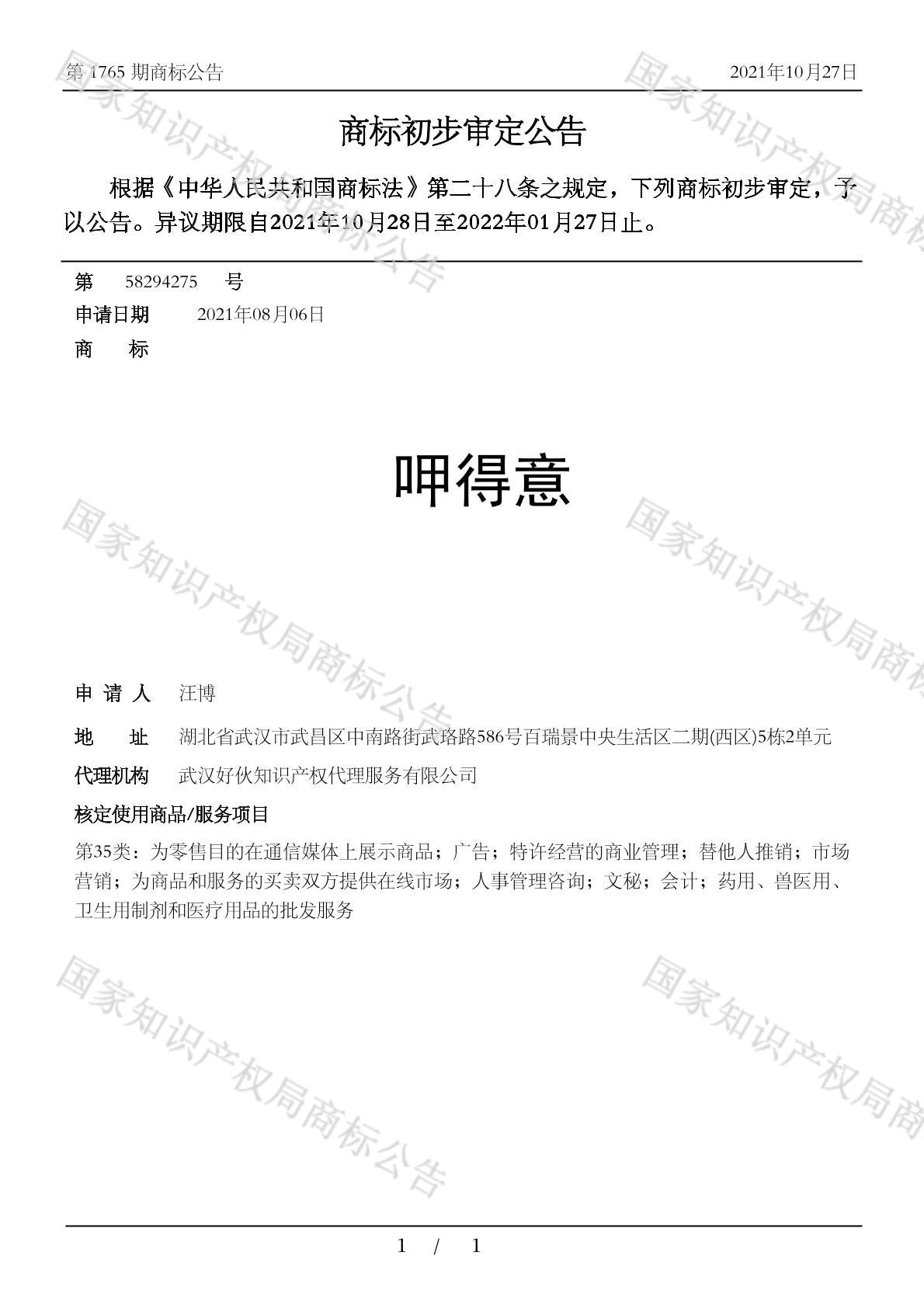 有效期限:2032-01-27 组合类型:中文注册号:58294275
