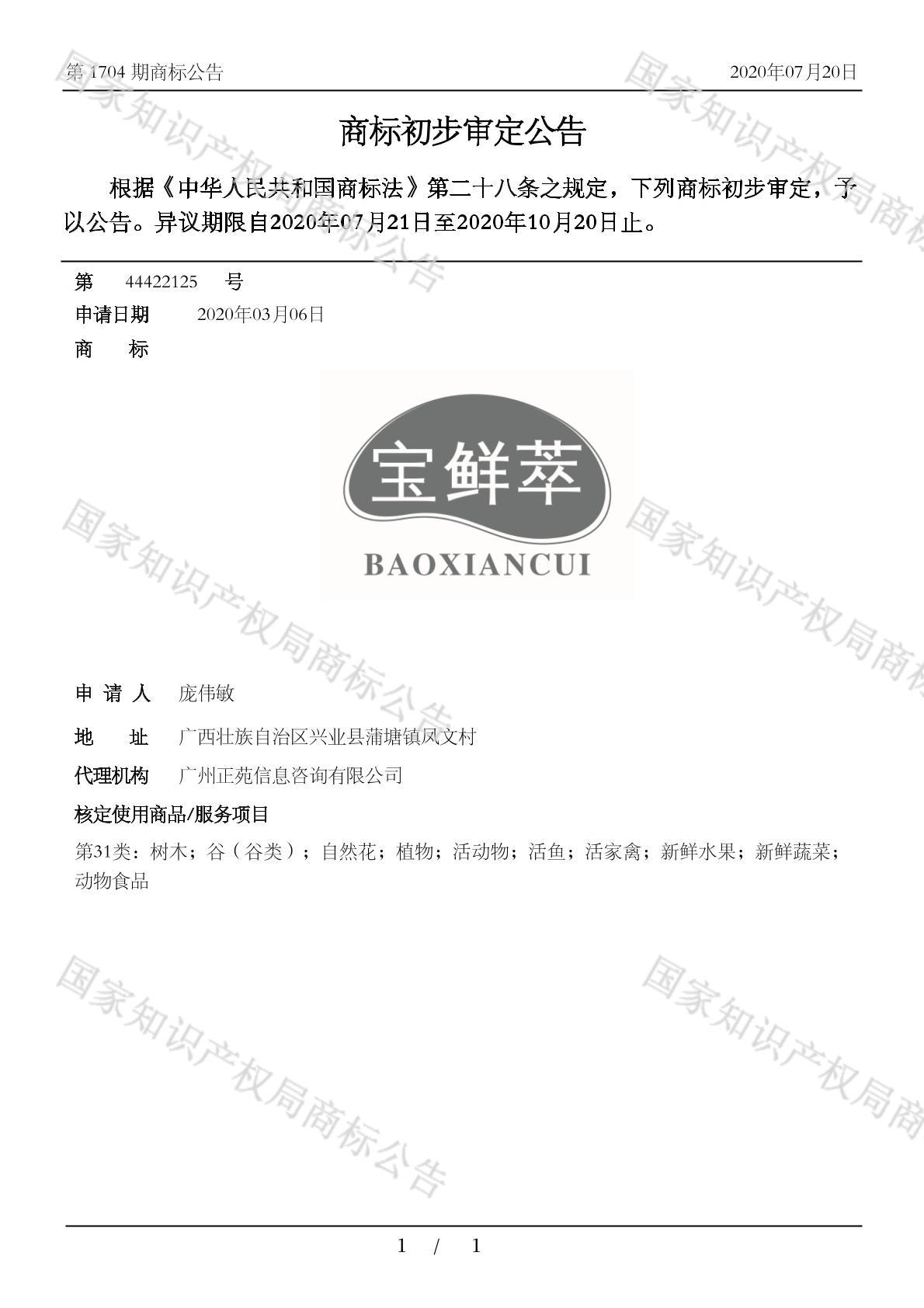有效期限:2030-10-20 组合类型:中文注册号:44422125