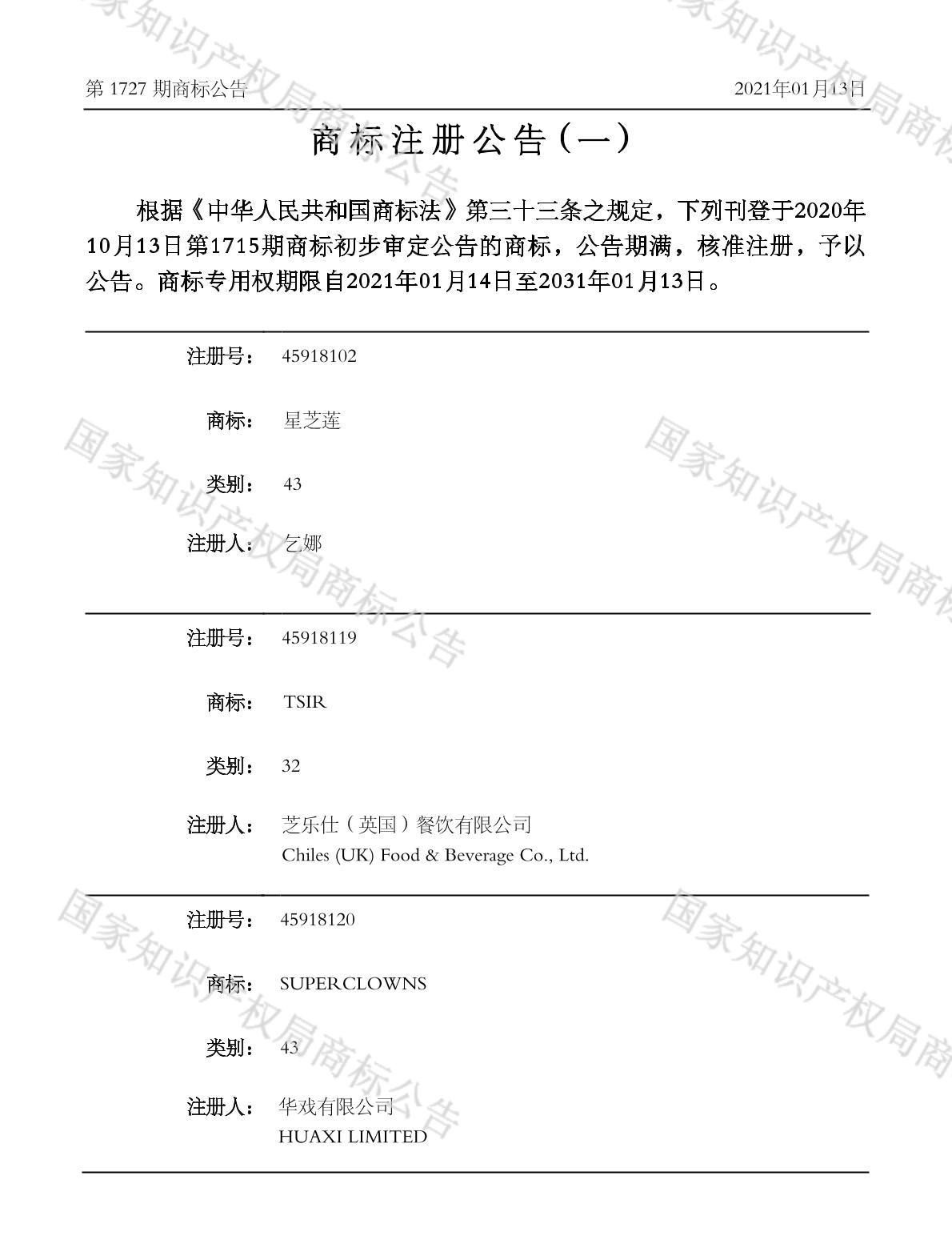 有效期限:2031-01-13 组合类型:中文注册号:45918119