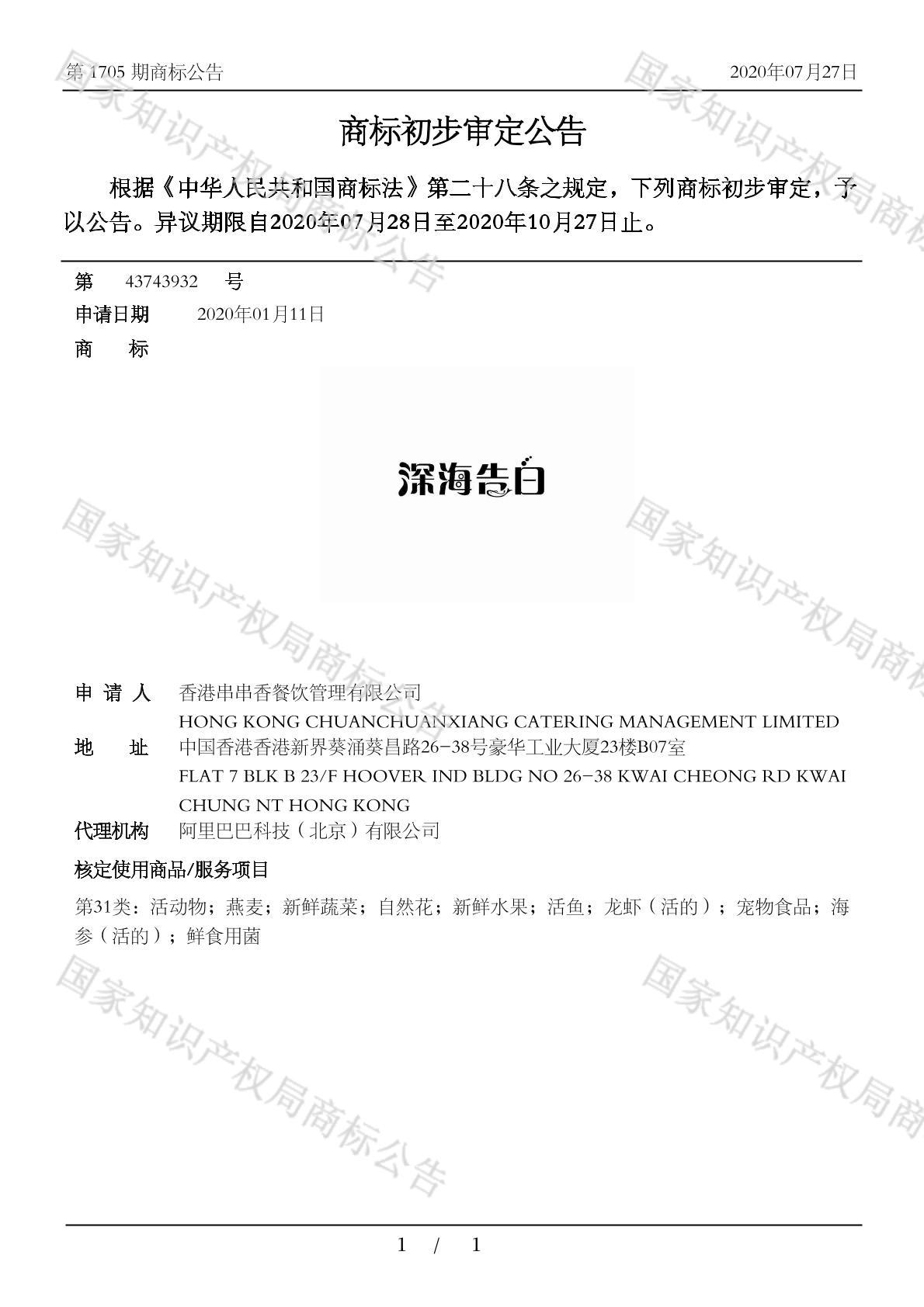 有效期限:2030-10-27 组合类型:中文注册号:43743932