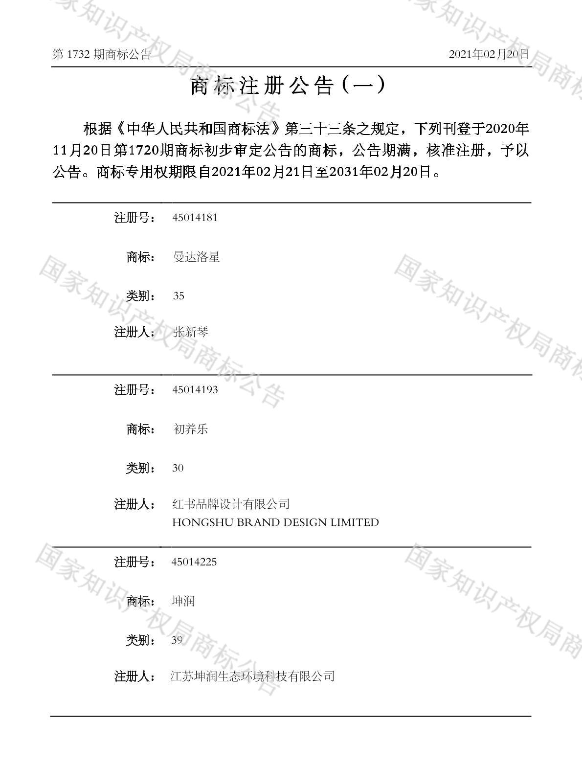 有效期限:2031-02-20 组合类型:中文注册号:45014193