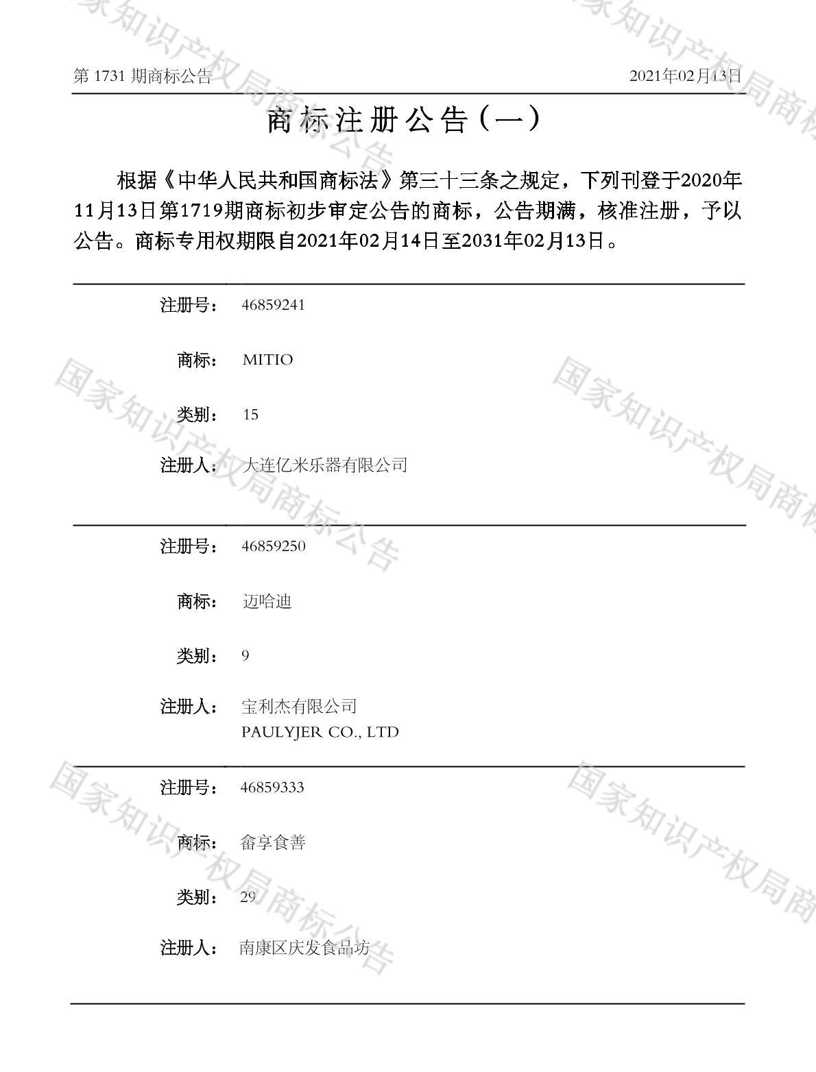 有效期限:2031-02-13 组合类型:中文注册号:46859250